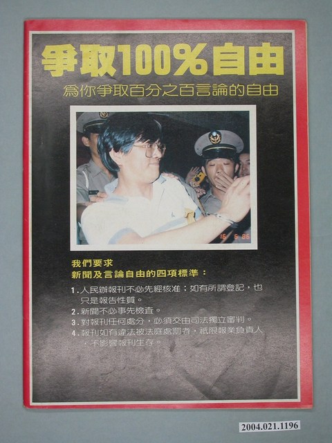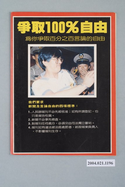此為一紙質雜誌,此物件以照片為封面,並以白色字體標示物件之名稱,本物件為1986年12月發行之《開拓時代》週刊第23期(自由時代系列總號第151號),封面內容計有〈解嚴還要拖多久?〉、〈國家安全法一日三變〉、〈監委選舉錢•錢•錢〉等。目錄計有(一)封面故事、(1)蔣經國不點頭,國安法難出籠、(2)國民黨內鬨,國安法擱淺、(3)沒有行憲,就是空話!――剖析國民黨的解嚴魔術、(4)千呼萬喚始出來,猶抱戒嚴半遮面――逐條批判「國安法」草案、(5)有效就好,管他違憲、(6)世界戒嚴奇觀、(二)自由觀點、(1)罷選,是根本原則問題、(三)焦點新聞、(1)面臨歷史審判的時刻、(2)只為堅持最後的尊嚴――選罷監委的政治意義、(3)罷選,當然有理!、(4)參選˙罷選˙各說各話――訪省市議員談監委選舉、(5)贏得監委,失去民心――北市監委選情大勢、(6)王玉雲左右高市監委選舉、(7)鈔票代替選票――省議會監委選情、(四)臺灣現象、(1)民進黨立委緊急質詢、(2)「運兵船」事件開庭記、(3)張溫鷹的選舉官司、(4)又一個「無法」和尚――吳大清落髮抗議政治迫害、(5)今朝失寵,門可羅雀――國民黨籍離職立委的下場、(6)臺灣的匯率操在華府手上?、(7)喪權辱國,要它做啥?――從菸酒談判談起、(五)台北風聲、(1)自立晚報能過關嗎?、(2)為什麼不能罷工?、(3)吳伯雄將接省主席、(六)天下傳真、(1)臺灣前途,不是國民黨的專利――年輕選民重視「自決」問題、(2)民進黨:脆弱的民主火苗、(七)國民黨官場現形記、(1)作繭自縛――包啓黃(上) 等。 此物件為《自由時代》系列雜誌之一,《自由時代》是黨外政論雜誌之一,於1984年3月12日由鄭南榕所創辦,並且標榜「爭取百分之百的言論自由」,雜誌內容致力於追蹤黨國內幕、打破禁忌話題、評議時政,同時也籌劃街頭社會運動,如:「五一九綠色行動」,其中鄭南榕為保護幫《自由時代》雜誌撰寫文章的作者,於是在目錄標示鄭南榕承擔一切文章的責任,且不在雜誌目錄頁寫上作者姓名。最終在1989年11月11日,鄭南榕自焚身亡7個月後,《自由時代》停刊。所謂「黨外」為中國國民黨之外的政治勢力,「黨外」在國民黨政府的治下運用創辦雜誌的方式表達立場、對抗國民黨政府,這些雜誌、出版品被稱為「黨外雜誌」,《自由時代》亦是其中之一。