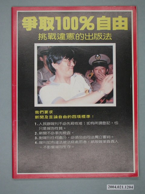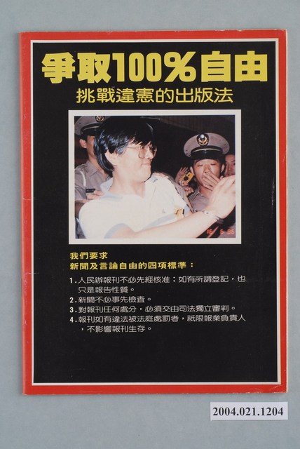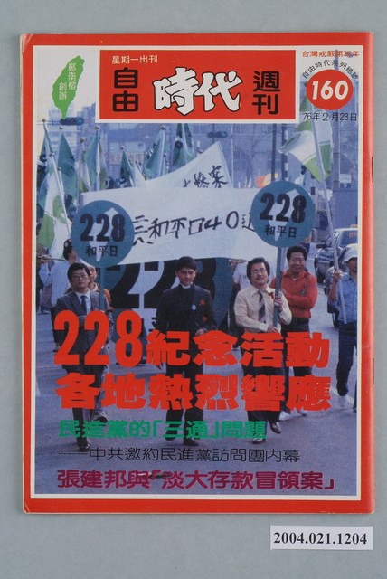 此為一紙質雜誌,此物件以照片為封面,並以白色字體標示物件之名稱,本物件為1987年2月發行之《自由時代》週刊(自由時代系列總號第160期),封面內容計有〈228紀念活動各地熱烈響應〉、〈民進黨的「三通」問題――中共邀約民進黨訪問團內幕〉、〈張建邦與「淡大存款冒領案」〉等。目錄計有(一)封面故事、(1)二二八紀念活動各地熱烈響應、(2)為化解仇恨而走――臺南市「二二八和平日」遊行記實、(3)以和平推展二二八紀念活動、(4)「二二八和平日促進會」成立律師團、(5)國民黨的二二八情結、(6)只要蔣經國說聲「對不起」――宜蘭遺老回憶二二八、(7)「二二八」冤魂――湯德章律師、(二)自由觀點、(1)要開報禁,先除惡法、(三)焦點新聞、(1)民進黨的「三通」問題――中共邀約民進黨訪問團內幕、(2)中共邀談民進黨?、(3)訪問團回台之夜、(4)許信良三度闖關?、(四)專題報導、(1)王永慶破碎的辦報夢、(2)解除報禁併發症、(五)臺灣現象、(1)張建邦與「淡大存款冒領案」、(2)封殺民進黨?――剖析「人民團體組織法」草案、(3)油價的歸油價,收稅的歸收稅――評李達海「壓歲錢買糖論」的誤謬、(4)冤獄尚未停止,司法仍須改造――「司法大廈滋擾案」宣判記、(5)蘇南成不願入「冷宮」、(六)新黨之頁、(1)民進報的登記問題、(2)黃玉嬌宣佈退黨、(3)國會黨團的動向、(4)陳水扁的再出發、(七)議會遊戲、(1)就職典禮,風暴在望、(2)正副院長,誰有資格、(3)假黨務改革,真派系鬪爭、(4)號稱開放,半開不放、(八)海外通訊、(1)唯有自決才能走出希望、(2)海外組織召開成員代表大會、(3)海外黨部問題懸而未決、(4)「臺灣政治發展研討會」進行討論、(5)民進黨赴美南掀起高潮、(九)天下傳真、(1)全斗煥激怒中產階級――「大學生刑求命案」風暴擴大、(十)萬能記者阿吉仔、(1)解除報禁損害軍力,院長任期到死為止、(十一)國民黨官場現形記、(1)封建活化石――孔德成㊦ 等。 此物件為《自由時代》系列雜誌之一,《自由時代》是黨外政論雜誌之一,於1984年3月12日由鄭南榕所創辦,並且標榜「爭取百分之百的言論自由」,雜誌內容致力於追蹤黨國內幕、打破禁忌話題、評議時政,同時也籌劃街頭社會運動,如:「五一九綠色行動」,其中鄭南榕為保護幫《自由時代》雜誌撰寫文章的作者,於是在目錄標示鄭南榕承擔一切文章的責任,且不在雜誌目錄頁寫上作者姓名。最終在1989年11月11日,鄭南榕自焚身亡7個月後,《自由時代》停刊。所謂「黨外」為中國國民黨之外的政治勢力,「黨外」在國民黨政府的治下運用創辦雜誌的方式表達立場、對抗國民黨政府,這些雜誌、出版品被稱為「黨外雜誌」,《自由時代》亦是其中之一。