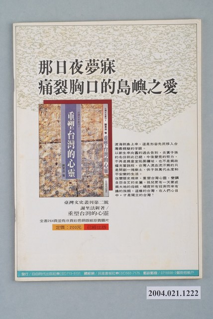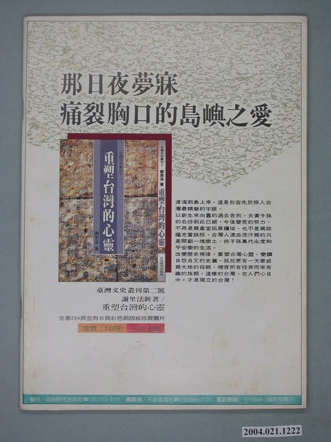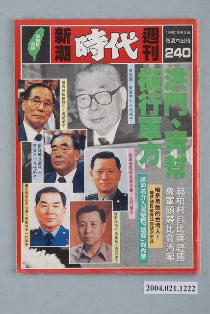 此為一紙質雜誌,此物件以照片為封面,並以白色字體標示物件之名稱,本物件為1988年9月發行之《新潮時代》週刊(總號第240期),封面內容計有〈洪門、青幫橫行軍方〉、〈郝柏村自比蔣經國,眾軍頭競比貪污案〉、〈咱是勇敢的臺灣人!――痛斥國民黨非法抓放洪奇昌〉、〈蔣仲苓介入吳榮根「婚變」的內幕〉等。目錄計有(一)時代觀點、(1)外表猶兒戲,內中藏算計――談洪奇昌遭非法拘提、(二)封面故事、(1)洪門、幫派,橫行軍方 郝柏村自比蔣經國,諸軍頭競比貪污案、(三)焦點新聞、(1)咱是勇敢的臺灣人!――八月二十九日,國民黨非法拘提洪奇昌現場報導 拘提交保,全憑國民黨的意思、(2)審判長變成被告,鄭春甲落荒而逃――八月卅日「六一二」案開庭審理、(3)為了拯救司法,按鈴申告鄭春甲、(4)抓我,是為了「清除街頭」――專訪洪奇昌、(四)特別報導、(1)「黃金義父」幕後遙控 「黃金義士」賠錢遮羞――副參謀總長蔣仲苓強力插手吳榮根「婚變」事件、(2)吳榮根――一棵「反共搖錢樹」?、(3)吳榮根做大買賣,年繳稅金一千萬――吳榮根「婚變」事件的另外一章、(五)臺獨風雲、(1)冤獄一時,獨立千秋――「臺獨案」對臺灣政局的影響、(2)𢙠是為臺灣人受難、(3)蔡許無罪亂判叛亂,陳趙有罪叛亂不判、(六)專題報導、(1)黨代表選舉聯線報導 黃信介V.S.姚嘉文――從黨代表選舉看民進黨黨主席之爭、(2)黨代表名單、(3)黨代表派系屬性分析表、(4)誰說錯了話?――訪姚嘉文談「新新聞」司馬文武的斷章取義、(5)禍從口出!――「黃張集團」成立「選務中心」,為黃信介重塑形象、(七)政治氣象台、(1)「廿一世紀」屬於李登輝?――廿一世紀基金會官商學大結合幕後、(2)李登輝明修棧道,馬樹禮暗渡陳倉、(3)退職條例一退再退,反動勢力仍然最大、(4)許水德替俞國華當箭靶、(八)街頭風潮、(1)靈車「巡視」總統府-記陳翠玉女士之葬禮、(2)千人遊行、萬人簽名,聲討蘇南成、(3)我愛蘭陽,不要「火電」――環保聯盟宜蘭分會至台電抗議火力發電廠之設立、(4)王永慶「買下」觀音六輕、(5)給陳履安上第一課――八個環保團體前往經濟部陳情抗議 等。 此物件為《自由時代》系列雜誌之一,《自由時代》是黨外政論雜誌之一,於1984年3月12日由鄭南榕所創辦,並且標榜「爭取百分之百的言論自由」,雜誌內容致力於追蹤黨國內幕、打破禁忌話題、評議時政,同時也籌劃街頭社會運動,如:「五一九綠色行動」,其中鄭南榕為保護幫《自由時代》雜誌撰寫文章的作者,於是在目錄標示鄭南榕承擔一切文章的責任,且不在雜誌目錄頁寫上作者姓名。最終在1989年11月11日,鄭南榕自焚身亡7個月後,《自由時代》停刊。所謂「黨外」為中國國民黨之外的政治勢力,「黨外」在國民黨政府的治下運用創辦雜誌的方式表達立場、對抗國民黨政府,這些雜誌、出版品被稱為「黨外雜誌」,《自由時代》亦是其中之一。