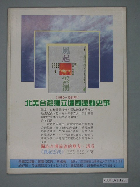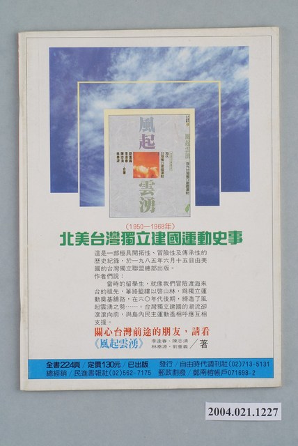 此為一紙質雜誌,此物件以照片為封面,並以白色字體標示物件之名稱,本物件為1988年11月發行之《先鋒時代》週刊(總號第249期),封面內容計有〈軍事強人八連霸,無人能制郝柏村〉、〈主席選戰風雲變幻,新潮流大大意失荊州〉、〈民進黨三全大會特別報導〉等。目錄計有(一)時代觀點、(1)黨內民主化才是民進黨的正途――寫在三全大會之後、(二)封面故事、(1)軍事強人八連霸,無人能制郝柏村、(2)黨政系統皆朝拜,強人成了搶手貨、(3)軍國大事,不容民進黨插手、(4)李登輝拉長戰線,郝柏村步步為營、(5)郝柏村留任,美國在台協會深表關切、(6)郝柏村欺騙生民、愚弄死人、(7)法治重要,還是人治重要?、(8)畫虎不成反類犬――郝柏村的「五虎將」、(三)特別報導、(1)黃信介揚眉吐氣,圓了主席夢――民進黨主席選舉現場報導、(2)黃信介談未來一年、(3)主席選舉到深夜,誰是最後投票人?、(4)主席何時選,水扁不發言、(5)中執委選情一夕數變,新潮流大意失荊州、(6)輪盤式配票學習國民黨、(7)公職黨內初選制――民進黨民主決心的試金石、(8)開大會怕分裂,新潮流忍忍忍、(9)朱高正的手勢,黨員們的抗勢、(10)民進黨邁入公職掛帥的年代、(11)姚嘉文談未來的民進黨、(12)「第三勢力」的尤清、謝長廷談民進黨未來、(13)一份「美麗」的喜悅、(14)新潮流的新動向、(15)黃信介當選主席,國民黨寄以厚望――分析主席大選之後的兩黨關係、(16)成為臺灣全體人民的政黨、(四)臺獨風雲、(1)開活路救臺灣,獨立!獨立!――長老教會舉行「關懷臺灣前途」遊行、(五)國會風雲、(1)建研會猛龍過江,派系鬥爭起風雲――國民黨增額立委成立「建設研究會」、(2)「有機會我也要跟他幹一場!」――一心會與集思會捉對廝殺、(3)政黨聯手演出退席秀――十月廿八日立院四十年來首次出現退席風波、(4)饒穎奇:一個爭議性人物、(六)社會運動場、(1)財閥拜金唯利是圖,導演「土地食人記」――新光紡織圖謀高價地利,片面停工士林廠、(2)資方校方聯手剝削,建教學生廉價勞工、(3)防止廠方脫產,員工以身擋車、(4)「菸酒工聯」代表大會無限期休會、(七)臺灣現象、(1)三個臭皮匠,擺平二千五百個諸葛亮――榮工處三家特權單位,聯合壟斷臺灣公共建設工程、(2)老法統步步進逼,李登輝步步為難 等。 此物件為《自由時代》系列雜誌之一,《自由時代》是黨外政論雜誌之一,於1984年3月12日由鄭南榕所創辦,並且標榜「爭取百分之百的言論自由」,雜誌內容致力於追蹤黨國內幕、打破禁忌話題、評議時政,同時也籌劃街頭社會運動,如:「五一九綠色行動」,其中鄭南榕為保護幫《自由時代》雜誌撰寫文章的作者,於是在目錄標示鄭南榕承擔一切文章的責任,且不在雜誌目錄頁寫上作者姓名。最終在1989年11月11日,鄭南榕自焚身亡7個月後,《自由時代》停刊。所謂「黨外」為中國國民黨之外的政治勢力,「黨外」在國民黨政府的治下運用創辦雜誌的方式表達立場、對抗國民黨政府,這些雜誌、出版品被稱為「黨外雜誌」,《自由時代》亦是其中之一。