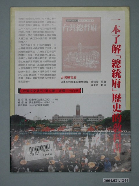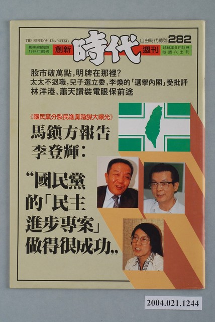 此為一紙質雜誌,此物件以照片為封面,並以白色字體標示物件之名稱,本物件為1989年6月發行之《創新時代》週刊(自由時代總號第282期),封面內容計有〈股市破萬點,明牌在哪裡?〉、〈太太不退職,兒子選立委,李煥的「選舉內閣」受批評〉、〈林洋港、蕭天讚裝電眼保前途〉、〈國民黨分裂民進黨陰謀大曝光――馬鎮方報告李登輝:“國民黨的「民主進步專案」做得很成功“〉等。目錄計有(一)時代觀點、(1)與國民黨鬥爭途中,同志為選舉分裂?――民進黨的反面教材、(二)封面故事、(1)從揚言分裂到黨內團結-美麗島系兩次會師「分裂邊緣」紀實、(2)國民黨分裂民進黨的詭計――馬鎮方報告「民主進步專案」成功、(3)對談是和解的開始――民進黨派系之爭交仲裁委員會處理、(4)「老頑童」黃信介?――黃信介在黨內紛爭中的角色混淆、(5)愈了解他,愈不支持他――雲林民進黨人士談三年來的朱高正、(6)我們要求是非!――訪新潮流系領導人物邱義仁、(7)國民黨特務一手捏造的「花瓶政黨」――從民、青兩黨被滲透、分化的歷史看民進黨分裂危機、(三)言論黑牢、(1)評論軍人等於「妨礙軍機」?、(2)謝史朗的聲明、(3)軍方立委蕭楚喬的「高論」、(4)爭取新聞自由人人有責、(四)政治氣象台、(1)沒有「替死鬼」俞國華,選戰責任李煥擔――李煥的「選舉內閣」為選舉使盡花招、(1.1)立法院連餐廳都有問題、(2)江山易移,放肆難改-李登輝逼過氣王昇表態否認有意競選副總統、(五)臺灣現象、(1)林洋港、蕭天讚叫法官們閉嘴、(1.1)高檢處的「叛亂妄想症」、(2)絕食抗議惡司法,生死讀秒林進勳、(3)拒絕污染的淨土――陳定南拒辦「聲援大陸民主運動」追悼會、(4)考期到了,熱情沒有了――臺大民主牆風光一時、(5)世界新專查禁二二八試題、(6)國之不國,何來侮辱國旗之罪?、(7)果然如期查禁!――新聞局信守承諾,封殺臺獨從不缺席、(六)民進黨之頁、(1)法庭是選戰的第一關――遭司法迫害牽制的民進黨公職候選人、(2)民進黨有那些「準候選人」?――民進黨黨內初選提名大勢初探、(七)特別報導、(1)「中國熱」現場的冷靜觀察――訪北京現場歸來的自立報系特派員黃德北、(2)臺灣客商,將是建國路上的先遣部隊、(八)臺獨風雲、(1)能活一塊算一塊――從「香港交由聯合國托管」談起、(2)行動創造歷史――深思熟慮後的犧牲,創造歷史新頁、(2.1)記一位北愛爾蘭的獨立志士、(九)財經熱線、(1)股市破萬點,那裡有明牌? 等。 此物件為《自由時代》系列雜誌之一,《自由時代》是黨外政論雜誌之一,於1984年3月12日由鄭南榕所創辦,並且標榜「爭取百分之百的言論自由」,雜誌內容致力於追蹤黨國內幕、打破禁忌話題、評議時政,同時也籌劃街頭社會運動,如:「五一九綠色行動」,其中鄭南榕為保護幫《自由時代》雜誌撰寫文章的作者,於是在目錄標示鄭南榕承擔一切文章的責任,且不在雜誌目錄頁寫上作者姓名。最終在1989年11月11日,鄭南榕自焚身亡7個月後,《自由時代》停刊。所謂「黨外」為中國國民黨之外的政治勢力,「黨外」在國民黨政府的治下運用創辦雜誌的方式表達立場、對抗國民黨政府,這些雜誌、出版品被稱為「黨外雜誌」,《自由時代》亦是其中之一。