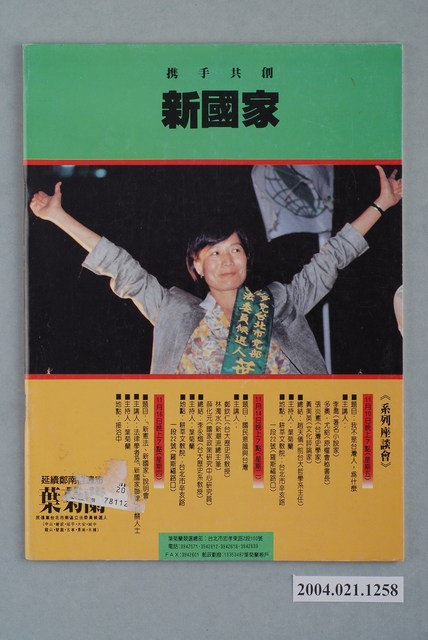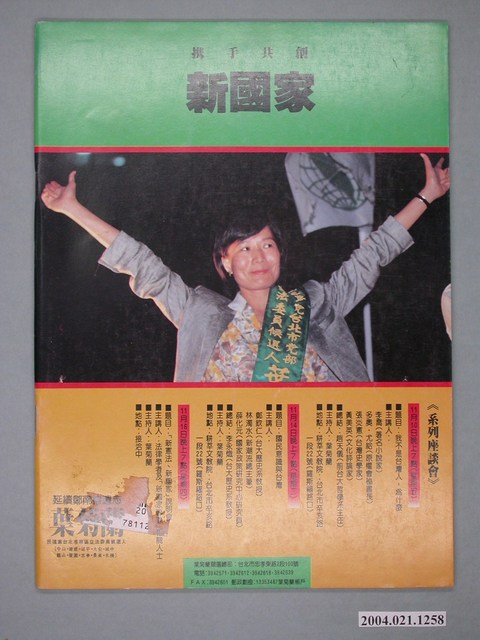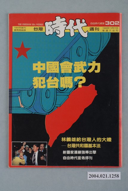 此為一紙質雜誌,此物件以插圖為封面,並以白色字體標示物件之名稱,本物件為1989年11月發行之《臺灣時代》週刊(自由時代總號第302期),封面內容計有〈中國會武力犯台嗎〉、〈林義雄給臺灣人的大禮――臺灣共和國基本法〉、〈新國家連線強棒出擊〉、〈自由時代宣布停刊〉等。目錄計有(一)時代觀點、(1)悠悠回首,恍如隔世――林義雄返臺的省思、(二)專題報導、(1)打破一黨壟斷,再創經濟春天――葉菊蘭的政治立場(二)、(2)確立臺灣主權,開拓外交新局――葉菊蘭的政治立場(三)、(三)封面故事、(1)中國會武力攻台嗎?、(四)特別報導、(1)「回來甲大家作夥,真好!」――林義雄回宜蘭受鄉親熱烈歡迎、(1.1)他變得更有自信――訪林義雄胞妹、(1.2)他帶具體的成績回來――訪陳菊談林義雄、(1.3)林義雄回台的目的是什麼?、(2)林義雄給臺灣人民的大禮、(2.1)林義雄的「選舉觀」、(3)宜蘭人要讓國民黨永遠「在野」?、(4)不同報紙對「基本法」,有不同的「基本看法」――訪各報社談林義雄的「基本法」、(5)主張臺灣共和國是否涉嫌叛亂?――從林義雄發表「臺灣共和國基本法草案」談政治表達自由、(五)選戰一九八九、(1)余案以「意外死亡」終結,余家不感意外、(1.1)拿衝鋒槍搶奪選票――陳湧源、陳源奇為選舉流血、(1.2)利矛厚盾,激戰南投――陳啓吉善於攻堅,林源朗後援十足、(2)榮星案冷飯熱炒,候選人各懷鬼胎、(2.1)當選縣長後,同志擱再來、(3)屠虎計劃與馬其諾防線――高雄三派齊出競逐縣長,游離票定江山、(3.1)一九八九年買票怪現象、(4)蔡辰洲的律師大戰美麗島的律師-謝長廷、陳水扁、林憲同三位律師的戰爭、(5)國民黨如果敗選,誰會下台?、(6)「政權可以更迭,環境只有一個」――張國龍為葉菊蘭「時代講座」系列主講環保問題、(6.1)「警車被砸」與葉菊蘭有何關聯?、(7)六千個熱情靈魂,一片天下父母心――十一月四日葉菊蘭推薦晚會紀實、(7.1)小劇場演「勇敢的母親」為葉菊蘭助選、(8)建立東方瑞士臺灣國――「新國家聯線」十一月六日正式成立、(8.1)第一部臺灣本土自製的憲法近日推出、(9)建立新國家,請與我們攜手同行、(六)政治氣象台、(1)李登輝不亮底牌,李煥只好低調表態、(七)臺灣現象、(1)摧毀吳鳳神話者無罪!――原住民拖毀吳鳳銅像案,獲無罪判決、(2)「示威」也是一種基本人權――談集會、遊行、示威的自由、(3)「香腸族」與你空中相見――無線電對講機玩家日益增多 等。 此物件為《自由時代》系列雜誌之一,《自由時代》是黨外政論雜誌之一,於1984年3月12日由鄭南榕所創辦,並且標榜「爭取百分之百的言論自由」,雜誌內容致力於追蹤黨國內幕、打破禁忌話題、評議時政,同時也籌劃街頭社會運動,如:「五一九綠色行動」,其中鄭南榕為保護幫《自由時代》雜誌撰寫文章的作者,於是在目錄標示鄭南榕承擔一切文章的責任,且不在雜誌目錄頁寫上作者姓名。最終在1989年11月11日,鄭南榕自焚身亡7個月後,《自由時代》停刊。所謂「黨外」為中國國民黨之外的政治勢力,「黨外」在國民黨政府的治下運用創辦雜誌的方式表達立場、對抗國民黨政府,這些雜誌、出版品被稱為「黨外雜誌」,《自由時代》亦是其中之一。
