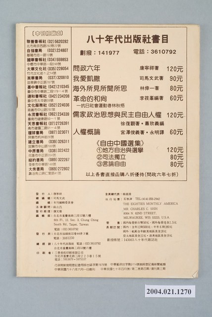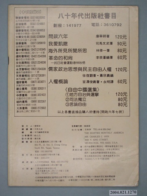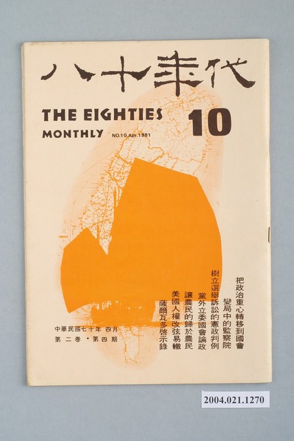 此為紙質雜誌,以交疊的臺灣地圖與帆船剪影為封面,為1981年4月發行之《八十年代》月刊第10號。本期封面內容計有〈把政治重心轉移到國會〉、〈變局中的監察院〉、〈樹立選舉訴訟的憲政判例〉、〈黨外立委國會論政〉、〈讓農民的歸於農民〉、〈美國人權改弦易轍〉、〈薩爾瓦多啟示錄〉等。目錄計有(一)社論、(1)迎接更大的歷史挑戰、(二)編輯室筆記、(三)讀者投書、(四)專題論述、(1)把政治重心轉移到國會(韓潭)、(2)變局中的監察院(陳哲倫)、(3)正視民間投資意願低落的嚴重問題(李嘉文)、(4)樹立選舉訴訟的憲政判例(蕭夫)、(5)讓農民的歸於農民(劉志傑)、(五)台北話題、(六)世界鳥瞰、(1)薩爾瓦多啓示錄(蘇和)、(2)馬德里的槍聲(李毅民)、(3)美國人權改弦易轍(印萬里)、(4)應否放棄卡特人權政策?(莊慕德譯)、(5)鮑德溫接受自由獎章 美國傾銷公害(周俊峯)、(七)國會專題、(1)揭開B型肝炎疫苗的紗幕(唐冠英)、(2)黨外立委國會論政(編輯部)、(3)國會散記(林進輝)、(八)短評短論、(1)建立正確的法治觀念(謝長廷)、(2)只重官意不重民意的新聞報導?(卓國豪)、(3)愚園閑話(黃順興)、(九)文學藝術、(1)韓國開採文化礦的氣魄與決心(李欽賢)、(2)書介-日本的南洋史觀(徐南傑)、(3)殷海光.林毓生書信錄(資料室)、(4)詩選、(4.1)請珍重-雅美的朋友(廖莫白)、(4.2)華西街掃瞄(海煙)、(5)Co Co漫畫集序(司馬文武)、(十)本期漫畫、(1)Co Co揮筆-阿歪從政(Co Co)、(2)妙妙貓.記者等(康文雄輯譯) 等。 此件為康寧祥發行、江春男總編的《八十年代》雜誌,為臺灣黨外雜誌的重要代表,有「黨外雜誌編輯群的搖籃」之稱,由學者以及新聞界從事批判性的政論,與黃信介發行的《美麗島》雜誌成為「黨外政治」運動兩條路線各自的代表。所謂「黨外」為中國國民黨之外的政治勢力,「黨外」在國民黨政府的治下運用創辦雜誌的方式表達立場、對抗國民黨政府,這些雜誌、出版品被稱為「黨外雜誌」,《八十年代》亦是其中之一。最終,這股媒體趨勢在1986年民進黨成立、1987年解除戒嚴之後逐漸式微。