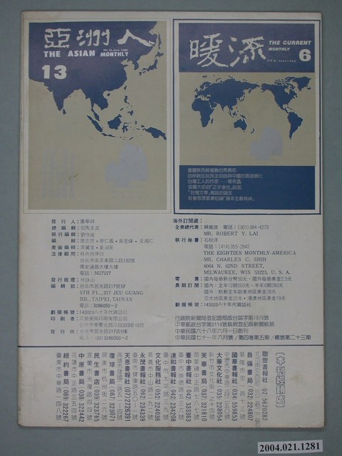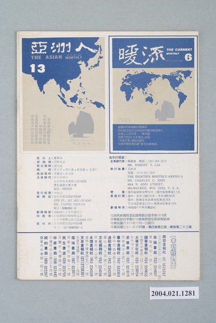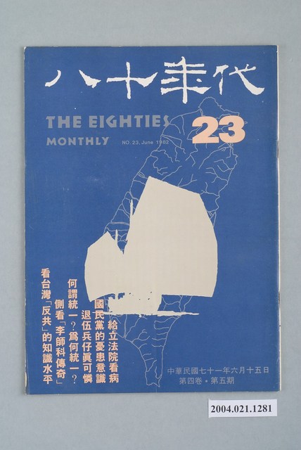 此為紙質雜誌,以交疊的臺灣地圖與帆船剪影為封面,為1982年6月發行之《八十年代》月刊第23號。本期封面內容計有〈給立法院看病〉、〈國民黨的憂患意識〉、〈退伍兵仔真可憐〉、〈何謂統一?為何統一?〉、〈側看「李師科傳奇」〉、〈看臺灣「反共」的知識水平〉等。目錄計有(一)社論、(1)國民黨的憂患意識、(二)編輯室筆記、(三)讀者投書、(四)目錄、(五)台北話題、(六)議會政治、(1)從衝突到整合、(2)給立法院看病(莊新義)、(3)「數人頭」的真諦(陳季安)、(4)一次民意的勝利-楚留香風波談起(秦瓌玉)、(5)老立委嘉言錄(康文雄)、(6)古胡玉美的反諷(倪良光)、(7)一波三折--台北市議會的黨內外爭執(聞何)、(七)專題、(1)「退伍兵仔」真可憐(張台生)、(2)側看「李師科傳奇」(韓良露)、(3)獨憐憂草澗邊生(李漢偉)、(八)法治、(1)等待社會的公道(游清清)、(2)鄭毅與肅竊組(江靜惠)、(3)「鄭毅作證」的邏輯幻想(張圭平)、(九)國內政治、(1)何謂統一?何為統一?(周殷華)、(2)張旭成演講側記(陳輝冠)、(3)看臺灣「反共」的知識水平(關凌漢)、(十)國際政情、(1)阿奎諾訪問記(林子季譯)、(2)波蘭戒嚴的真相-給喬治.肯南的一封信(員人譯)、(3)蘇俄自由工聯的目標(郭正發譯)、(十一)經濟、(1)國營事業總檢討(小喬)、(2)日本的影子在臺灣(吳興堡譯)、(十二)教育、(1)教官管得太多了(吳重達)、(2)校園自治在東京帝大(駱新民)、(3)日本都不能,我們那有辦法?(周庚)、(十三)勞工、(1)十七歲的嗚咽(江水涵)、(十四)愚園閒話、(1)要命的虛脫(黃順興)、(十五)漫畫(康文雄輯) 等。 此件為康寧祥發行、江春男總編的《八十年代》雜誌,為臺灣黨外雜誌的重要代表,有「黨外雜誌編輯群的搖籃」之稱,由學者以及新聞界從事批判性的政論,與黃信介發行的《美麗島》雜誌成為「黨外政治」運動兩條路線各自的代表。所謂「黨外」為中國國民黨之外的政治勢力,「黨外」在國民黨政府的治下運用創辦雜誌的方式表達立場、對抗國民黨政府,這些雜誌、出版品被稱為「黨外雜誌」,《八十年代》亦是其中之一。最終,這股媒體趨勢在1986年民進黨成立、1987年解除戒嚴之後逐漸式微。