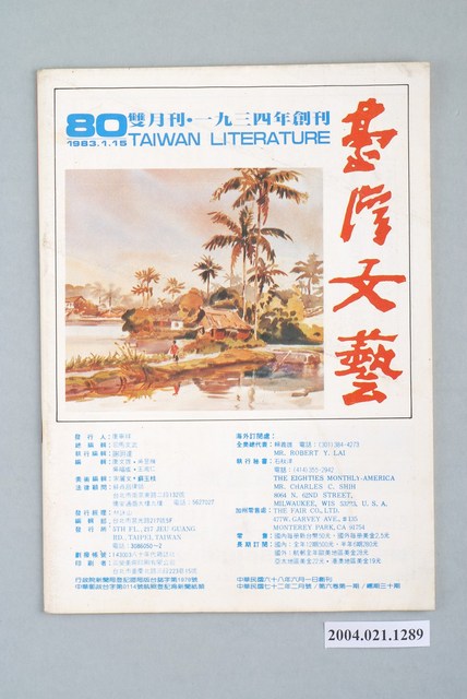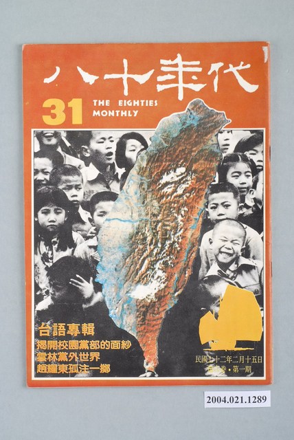 此為紙質雜誌,以交疊的臺灣地圖與帆船剪影為封面,為1983年2月發行之《八十年代》月刊第31號,本期為「臺語專輯」。封面內容計有〈揭開校園黨部的面紗〉、〈雲林黨外世界〉、〈趙耀東孤注一擲〉等。目錄計有(一)社論、(1)流氓的法令、(二)編輯室筆記、(三)讀者投書、(四)台北話題、(五)特載、(1)夢回臺灣-遙寄義雄(宜蘭郎)、(六)語言專論、(1)為什麼不能講媽媽教我的話?(專欄組)、(2)論國語與方言-國語、閩南語、客家語應並列為官定語言(夏宗漢)、(3)台語與政見發表會(劉禹民)、(4)台語,你的名字是方言-電視台語節目的處境(史敬一)、(5)學校也有「台語課」-日據時期語言政策回顧(王大佑)、(6)大家談、(7)番薯仔講國語(陳文雄)、(8)外省囝仔講台語(江水涵)、(9)學生講方言有「罪」嗎?(廖明璋)、(七)校園危機、(1)揭開國民黨校園黨部的面紗(柳玉青)、(2)部長,您別哭,我錯了!(林老白)、(八)黨外世界、(1)蠻荒.文明.雲林客-群雄並起的雲林黨外(高武雄)、(九)高屏動態、(十)國內政情、(1)選運要與工運結合-寄望高市立委改選(知山)、(2)文官.黨工.軍特-淺談國民黨權力核心(陳必勝)、(十一)財經論衡、(1)國營事業虧損誰負責?(蘇蘊)、(2)「趙鐵頭」成了「趙大頭」?-從中日混血大汽車廠成立談起(東平)、(3)世界汽車業決戰福爾摩沙(沈文輝)、(十二)國防軍事、(1)老鷹與小雞-臺灣的國防現狀(吳家珍譯)、(2)訪國防部長宋長志(吳家珍譯)、(十三)政策批判、(1)憑什麼「法」取締電玩?(端木軒)、(十四)歷史、(1)中國古書內的臺灣(黃燦庭)、(2)歷史的同情(朱欽德)、(3)美國為何放棄國民政府?(柯漢著/陳作民譯)、(十五)幽默、(1)老舍幽默文選 新年醉話/考而不死是為神(資料室) 等。 此件為康寧祥發行、江春男總編的《八十年代》雜誌,為臺灣黨外雜誌的重要代表,有「黨外雜誌編輯群的搖籃」之稱,由學者以及新聞界從事批判性的政論,與黃信介發行的《美麗島》雜誌成為「黨外政治」運動兩條路線各自的代表。所謂「黨外」為中國國民黨之外的政治勢力,「黨外」在國民黨政府的治下運用創辦雜誌的方式表達立場、對抗國民黨政府,這些雜誌、出版品被稱為「黨外雜誌」,《八十年代》亦是其中之一。最終,這股媒體趨勢在1986年民進黨成立、1987年解除戒嚴之後逐漸式微。