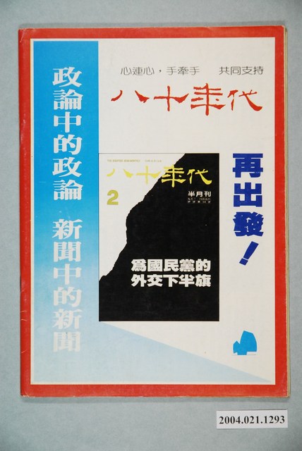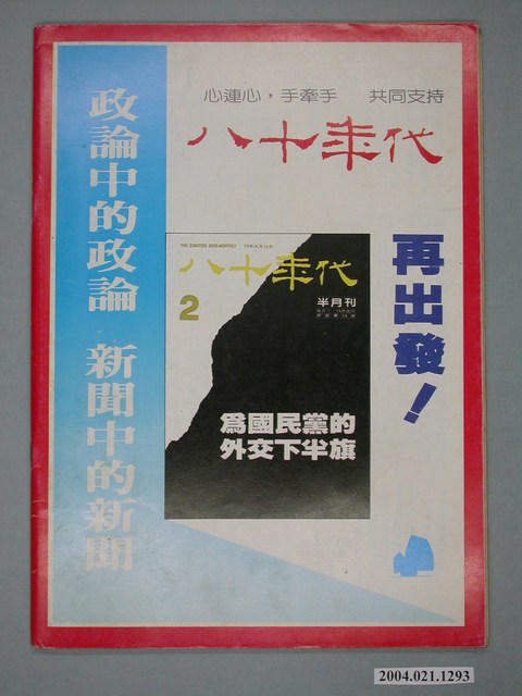 此為紙質雜誌,為1984年5月發行之《八十年代》半月刊第3期(總號第35號)。本期封面內容計有〈蔣經國的人馬〉、〈國民黨的「危機內閣」〉、〈劉大任小說長期連載――「浮游群落」〉等。目錄計有(一)社論:北京˙香港˙臺灣、(二)封面故事、(1)蔣經國的人馬(馮仲庵)、(2)徹底改造國民黨的領導班子(程強仁)、(3)臺灣需要什麼樣的政治人才?(徐明山)、(4)國民黨的「危機內閣」(蔣良任)、(三)黨外學、(1)從嬉皮、野皮到優皮-論哈特的飄浮雨脆弱(南方朔)、(四)國民黨學、(1)國民黨喜歡辦報?(陳天來)、(五)世界舞台、(1)兩岸猿聲啼不住,輕舟已過萬重山!-撥開雷根訪問中共的煙幕(孫子淵)、(2)國際話題:韓國大學生的精神不死/美國對亞政策的轉變(劍泉)、(六)臺灣研究、(1)山地民族問題系列:我們不要被滅種-山地民族的控訴(阿庫瑪)、(七)校園動態、(1)「幹」,不幹了!-臺大代聯會主席辭職聲明(吳叡人)、(八)八十論壇、(1)該來的不來-省議會要求省主席列席報告預算編製(李傳得)、(2)中國的標準記者?(趙義)、(3)漲價與順民-兼論國民黨權力轉移症候群(歐陽德)、(九)財經頻道、(1)新台幣又要貶值了!政府是通貨膨脹的罪魁禍首(吳立台)、(2)「侏儒外交」併發症-美商寶碱公司來臺投資案幕後(陳順輝)、(3)豐田到底來不來?(蘇立武)、(十)台北話題、(十一)地方新聞、(十二)黨外副刊、(1)政治小說長篇連載:浮游群落➀(劉大任)、(2)文化界:楊青矗與周令剛/國民黨的「邊疆」心態/林昭亮到大陸/新聞局攔截「絲路」/「春風」遭停刊/「出版獎助條例」、(3)誰在看讀者文摘?(賴祖義) 等。 此件為康寧祥發行、江春男總編的《八十年代》雜誌,為臺灣黨外雜誌的重要代表,有「黨外雜誌編輯群的搖籃」之稱,由學者以及新聞界從事批判性的政論,與黃信介發行的《美麗島》雜誌成為「黨外政治」運動兩條路線各自的代表。所謂「黨外」為中國國民黨之外的政治勢力,「黨外」在國民黨政府的治下運用創辦雜誌的方式表達立場、對抗國民黨政府,這些雜誌、出版品被稱為「黨外雜誌」,《八十年代》亦是其中之一。最終,這股媒體趨勢在1986年民進黨成立、1987年解除戒嚴之後逐漸式微。