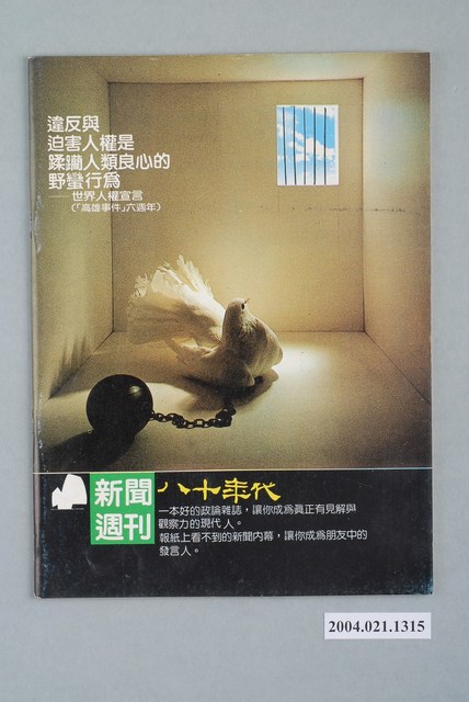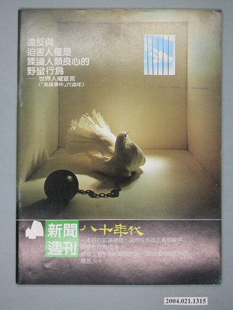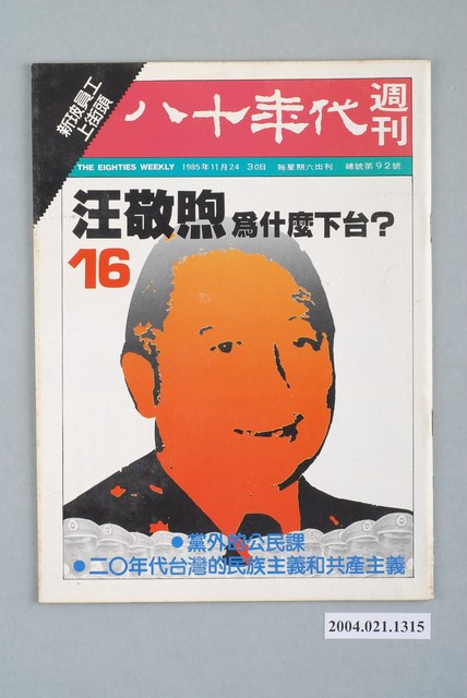 此為紙質雜誌,為1985年11月發行之《八十年代》週刊第16期(總號第92號)。本期封面內容計有〈汪敬煦為什麼下臺?〉、〈黨外的公民課〉、〈二○年代臺灣的民族主義和共產主義〉、〈新玻員工上街頭〉等。目錄計有(一)社評:國民黨的儀式行為、(二)封面故事、(1)汪敬煦為什麼下台?(謝春生)、(2)臺灣六大情治系統一覽、(三)政治觀察、(1)中常委是活道具?-從三中全會談起(鄭志文)、(2)黨外的公民訓練-探討後援會的報告(徐文展)、(3)國民黨為什麼不敢通過省縣自治通則、(四)特別報導、(1)省市議會的新戰局、(2)台北市議會(秦天隆)、(3)高雄市議會(張清標)、(4)臺灣省議會(李士卿)、(五)新聞人物、(1)一年內要作組黨準備-尤清訪問記(楊丹青)、(2)新玻的小教父-王志勤(顏啓佑)、(六)頭條新聞、(1)鳳山農會「流失」二億元疑案(王真)、(2)選舉併發症-影視歌星被集體動員助選的問題與代價(許守人)、(3)大官捷足「先登」,工人頓腳「走路」-中船公司大裁員經過(張懷德)、(4)新玻員工上街頭(本刊採訪組)、(5)大頭仔的冤大頭-高市在地報貸款曝光始末(莊風和)、(6)軍法人員強渡法院?(洪宜君)、(7)官兵捉強盜-談電影分級制度(張中凱)、(8)此法不通-語文法座談會(本刊編輯部)、(9)保護語文自然生態-歐美國家的一些例子(委瑞芳)、(10)國民黨不喜歡阿拉斯加石油(馬文)、(七)歷史檔案、(1)臺灣一九二○年代的民族主義和共產主義(作者:簡烱仁/譯者:李筱峯)、(八)特稿、(1)尋找新方向的臺灣(作者:白魯洵/摘譯:陳志清)、(九)壓卷人物、(1)度小月中的林洋港 等。 此件為康寧祥發行、江春男總編的《八十年代》雜誌,為臺灣黨外雜誌的重要代表,有「黨外雜誌編輯群的搖籃」之稱,由學者以及新聞界從事批判性的政論,與黃信介發行的《美麗島》雜誌成為「黨外政治」運動兩條路線各自的代表。所謂「黨外」為中國國民黨之外的政治勢力,「黨外」在國民黨政府的治下運用創辦雜誌的方式表達立場、對抗國民黨政府,這些雜誌、出版品被稱為「黨外雜誌」,《八十年代》亦是其中之一。最終,這股媒體趨勢在1986年民進黨成立、1987年解除戒嚴之後逐漸式微。