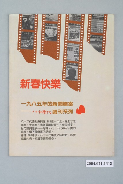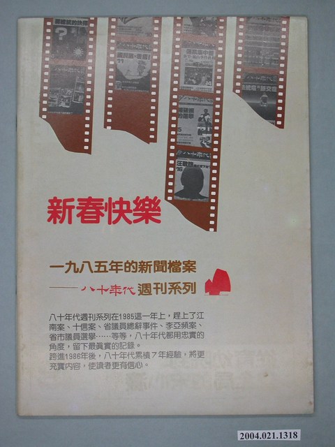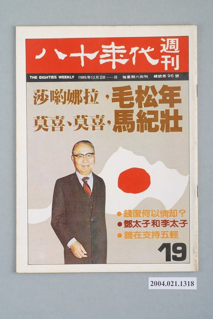 此為紙質雜誌,為1985年12月發行之《八十年代》週刊第19期(總號第96號)。本期封面內容計有〈莎呦娜拉,毛松年 莫喜、莫喜,馬紀壯〉、〈錢復何以情怯?〉、〈鄧太子和李太子〉、〈誰在支持五輕〉等。目錄計有(一)封面裏:李登輝的喬遷之喜、(二)社評:國民黨的披風-憲法!?、(三)封面故事:莎喲娜拉,毛松年!莫喜、莫喜,馬紀壯!、(1)痛論中日外交-從毛老夫子下台談起(司馬文武)、(2)從秘書長到駐日代表-馬紀壯使日的曲折過程(賴祖義)、(3)臺灣派駐日本的使節,日本派駐臺灣的使節(本刊資料室)、(四)新聞人物、(1)錢復何以情却?(周新成)、(五)政治觀察、(1)消除政治疑慮的秘方(李忠人)、(2)國民大會的內戰-現場報導(黃天洋)、(3)鄧太子與李太子(魏樵)、(六)進入現場:議會鬪爭的力與理、(1)台北市議會現場報導(洪新榮)、(2)省議會現場報導(徐志中)、(3)高雄市議會現場報導、(七)台北話題、(1)省營事業的將軍族、(1.1)美參議員「因故」取消來臺、(1.1.1)為怕黨外人士「利用」?、(1.2)李表哥曝光、(1.2.1)李小龍造型翻版、(1.3)歲末年終大裁員、(1.3.1)中船應為員工找出路、(八)特別報導、(1)誰在支持「五輕」計劃?(游商)、(2)「五輕」計劃的玄機?(陳啓成)、(九)頭條新聞、(1)臺灣是「愛國華僑」的掏金天堂?-揭開洪恭蘭、鄭周敏、莊清泉的真面目(杜雅言)、(十)黨外佈告欄、(1)政治廚房中的黨外女性-記「黨外婦女聯誼會」(呂秀蓮)、(2)周伯倫詆毀元首?、(3)新竹大對決、(4)林熺達脫黨競選、(5)江鵬堅為外交請命、(6)公政會修改章程、(十一)北京參考消息、(1)一九八五年的中國大陸(希瑞˙伯格輯)、(2)哈囉!電話不通!(馬文)、(十二)年終獎、(1)一九八五年的「金牛獎」(康文雄)、(十三)壓卷人物、(1)開明的總統?專制的父親? 等。 此件為康寧祥發行、江春男總編的《八十年代》雜誌,為臺灣黨外雜誌的重要代表,有「黨外雜誌編輯群的搖籃」之稱,由學者以及新聞界從事批判性的政論,與黃信介發行的《美麗島》雜誌成為「黨外政治」運動兩條路線各自的代表。所謂「黨外」為中國國民黨之外的政治勢力,「黨外」在國民黨政府的治下運用創辦雜誌的方式表達立場、對抗國民黨政府,這些雜誌、出版品被稱為「黨外雜誌」,《八十年代》亦是其中之一。最終,這股媒體趨勢在1986年民進黨成立、1987年解除戒嚴之後逐漸式微。