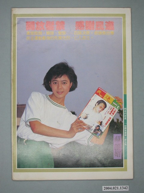 此為一紙質雜誌,此物件以相片(國民黨第一現場指揮官:台北市警察局長――廖兆祥)為封面,邊框為紅黃綠三色,並以黃、紅字體標示物件之名稱,本物件為1987年5月發行之《民進週刊》第14號,封面內容計有〈519國父紀念館示威遊行現場實況〉等。目錄計有(一)民進觀點、(1)立正!向黨看齊!(蘇瑞)、(二)讀者進場,編者候教、(1)為民進黨寫首黨歌、(2)訂電話到電視台抗議、(3)惡意的攻擊是我們的磨刀石、(4)誰來槍斃吸血鬼、(5)蔡辰洲做鬼要抓人、(三)封面故事、(1)蔣緯國的「修正路線」――五一九前夕(本刊採訪組)、(2)五一九國父紀念館示威遊行現場實況報導、(3)十三位立委一致投入第一線、(4)蕭裕珍、蔡式淵、洪奇昌率領三支突擊兵團、(5)尤清和廖兆祥非法集會、(6)許勝發風雨生信心、(7)廖兆祥老馬不識路、(8)出口太大挨臭罵、(9)鋼筆無用武之地、(10)女記者上山容易下山難、(11)「臺灣好」實在太大聲了、(12)台北的雨繼續下吧、(13)李登輝召見馬樹禮、(14)民進黨社會運動部初試啼聲、(15)陳清喜的一支小雨傘、(16)楊永智學習做爸爸、(17)男士包圍咖啡室、(18)美容院和西藥房是大贏家、(19)一通市內電話九十元、(20)民進黨發表五一九抗議活動聲明、(21)廖兆祥早就想下台了、(22)朱高正要收版稅、(四)臺灣來的、(1)「平民總理」的啓示(林顯榮)、(五)蔣主席辦公室、(1)蔣經國的「恩師之子」陳履安(陸平)、(2)陳履安會不會擊敗李登輝、(3)參軍長出列(林冲)、(4)聯合報陷害周慕文、(5)臺灣錢淹腳目、(6)趙少康棒打周慕文、(7)林聯輝礮轟蔣經國、(六)臺灣遠景、(1)決戰亞銀(小市民)、(七)江主席辦公室、(1)司法革新從這三十七條開始、(八)人生舞台、(1)他們叫我再脫一次(宜蘭人)、(九)黃昏的故鄉、(1)臺灣左翼集結出發、(2)吳淑珍窮追不捨援助尼加拉瓜案、(3)劉俊寬之死引起學生注意、(4)中船工會品管中船公司、(5)關懷臺灣基金會宣佈本年度助學金 等。 《民進周刊》為1987年2月19日創刊的黨外雜誌,創辦人為吳祥輝。此刊物曾陸續以《民進時代》、《民進廣場》、《民進天地》、《民進世界》等名稱出版,最終在1990年8月20日停刊。此刊物標榜「不是機關報」、「人民第一、民進黨第二」,另《民進周刊》雖然在政治立場與民進黨親近,所謂「黨外」為中國國民黨之外的政治勢力,「黨外」在國民黨政府的治下運用創辦雜誌的方式表達立場、對抗國民黨政府,這些雜誌、出版品被稱為「黨外雜誌」,《民進周刊》系列亦是其中之一。