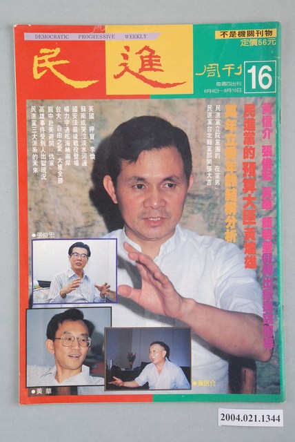 此為一紙質雜誌,此物件以相片(黃信介、張俊宏、黃華)為封面,邊框為紅黃綠三色,並以黃、紅字體標示物件之名稱,本物件為1987年6月發行之《民進週刊》第16號,封面內容計有〈黃信介 張俊宏 黃華 顏明聖假釋出獄追蹤報導〉、〈民進黨的預算大臣黃煌雄〉、〈萬年立委年齡結構分析〉、〈民進黨立院黨團的「在室男」〉、〈民進黨台北縣黨部開張大吉〉、〈美國「押寶」李煥〉、〈蘇南成哭泣淡水河邊〉、〈國安法最後戰役登場〉、〈楊力宇通吃海峽兩岸〉、〈臺大「自由之愛」大獲全勝〉、〈關中赴美避開「仇家」〉、〈高雄事件受刑人出獄現況〉、〈民進黨三大派系的未來〉等。目錄計有(一)民進觀點、(1)全體肅立,恭請閱兵(蘇瑞)、(二)讀者進場,編者候教、(1)任何觀點有表達自由、(2)請不要束縛宗教自由、(3)允許雜誌設立記者、(4)美國行憲紀念日的啓示、(5)尊重謝長廷的意願、(6)牛肉場侵蝕純樸山村、(7)我們不鼓勵大家樂、(三)身歷其境、(1)黃信介張俊宏黃華顏明聖假釋出獄追蹤報導(本刊採訪組)、(2)出獄計、(2.1)黃信介:美麗島的龍頭老大、(2.2)張俊宏:反對運動的理論大師、(2.3)黃華:組織新黨的運動家、(2.4)顏明聖:理性主義的行動者、(3)三進三出,無怨無悔――黃華、顏明聖訪談錄、(4)美麗島受刑人現況、(5)各界將盛大歡迎黃信介等人、(四)封面故事、(1)民進黨的預算大臣黃煌雄(艾翠)、(2)民進黨立院黨團的「在室男」、(3)郊遊「走不知路」臺灣史傷眼睛、(4)立院黨團是小型民進黨、(5)黨外前輩仙角匯合民進黨、(五)國會現形錄、(1)朱高正破口大罵金紹賢(衛揚)、(2)資深立委萬歲萬歲萬萬歲(陸平)、(3)國安法最後戰役登場、(4)吳淑珍「平面問政」的新方向、(六)第一線小子、(1)十二個老師˙一種心情(吳祥輝)、(七)蔣主席辦公室、(1)黃信介張俊宏等人釋放內幕、(2)劉和謙巡視太平島、(3)楊力宇通吃海峽兩岸、(4)美國押寶李煥、(5)曹建中煮熟的鴨子飛了、(6)關中赴美避開「仇家」、(7)廖兆祥慘遭批鬥、(8)朱宗軻淡化新聞第一名、(八)黨的建設、(1)民進黨的遠景(劉一德)、(九)首都議場、(1)台北市年度總預算大決戰(斯民)、(2)郁慕明哭了、(3)審查預算不要面子、(4)陳世昌發表「愛國論」、(十)江主席辦公室、(1)民進黨總結五一九、(2)主席出門,費老當家、(3)民進黨中央黨部主動發佈新聞、(4)民進黨台北縣黨部開張大吉、(5)民進黨屏東縣黨部快步急追、(十一)民進青年、(1)臺大「自由之愛」大獲全勝(陳介仁)、(2)臺大學生反對勢力的封神演義(張無派)、(十二)、(1)高雄鹽埕分局事件第二次開庭記(余種懷)、(2)蘇南成哭泣淡水河邊、(3)黃昭輝吳昱輝官訟纏身、(4)自由時代勞資糾紛大地震、(5)臺大教授聯盟會開始運作、(6)「人權運動屏東聯誼會」成立會館、(7)「返鄉探親促進會」成員遭毆打 等。 《民進周刊》為1987年2月19日創刊的黨外雜誌,創辦人為吳祥輝。此刊物曾陸續以《民進時代》、《民進廣場》、《民進天地》、《民進世界》等名稱出版,最終在1990年8月20日停刊。此刊物標榜「不是機關報」、「人民第一、民進黨第二」,另《民進周刊》雖然在政治立場與民進黨親近,所謂「黨外」為中國國民黨之外的政治勢力,「黨外」在國民黨政府的治下運用創辦雜誌的方式表達立場、對抗國民黨政府,這些雜誌、出版品被稱為「黨外雜誌」,《民進周刊》系列亦是其中之一。