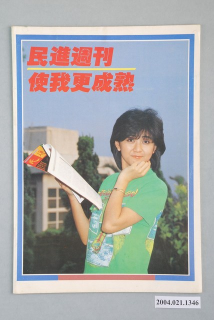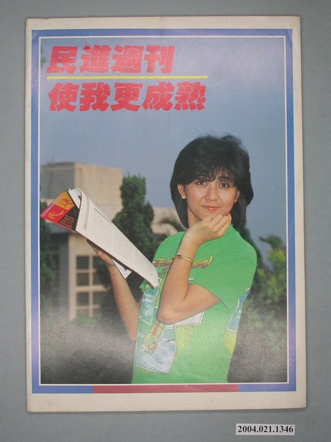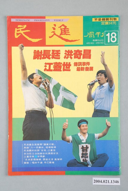此為一紙質雜誌,此物件以相片為封面,邊框為紅黃綠三色,並以黃、紅字體標示物件之名稱,本物件為1987年6月發行之《民進週刊》第18號,封面內容計有〈謝長廷 洪奇昌 江蓋世傳訊事件最新發展〉、〈民進黨全面展開「護黨行動」〉、〈高雄「六一四事件」現場報導〉、〈民進黨街頭「甘地」江蓋世〉、〈政治犯立法院靜坐抗議國安法〉、〈江蓋世氣○宋美齡〉、〈「反共愛國陣線」要殺尤清 康寧祥〉、〈國歌:唱你千遍 早已厭倦〉等。目錄計有(一)民進觀點、(1)大道之「行」也,天下為公(蘇瑞)、(二)讀者進場,編者候教、(1)反制就是反而被制服、(2)請正視街頭運動、(3)不要妨害別人的自由、(4)民進黨的情報局、(三)身歷其境、(1)六一二事件真相專輯(本刊採訪組)、(2)急急如律令:民進黨全面展開「護黨行動」、(3)公正處理六一二事件、(4)高速公路普渡愛國會、(5)「反共愛國陣線」的安樂窩、(6)「反共愛國陣線」要殺尤清朱高正、(7)香港殺手挑戰臺灣警察、(8)天啊!他們用國旗打我、(9)群眾夜奔、(四)江主席辦公室、(1)那一夜,老康是流淚,不是放水、(2)康寧祥黃宗文出面協調內幕、(3)王化榛黃爾璇黃宗文三邊會談、(4)民進黨杯葛國大聯誼會幹事改選、(5)吳淑珍聲援六一二行動、(6)費希平趁機整合市議會黨團、(7)張俊雄為王幸男奔喪大力奔走、(五)人生舞台、(1)阿扁策馬入林,閻王甘拜下風(楊翠)、(六)封面故事、(1)謝長廷洪奇昌江蓋世傳訊事件最新發展(張逸塵)、(2)謝長廷說:我就是「首謀者」、(3)江蓋世氣宋美齡、(4)國防部警告楊金海、(5)政治犯立法院靜坐抗議國安法、(6)民進黨國大黨團拜會總統府、(七)民進青年、(1)民進黨的街頭「甘地」江蓋世(林靜英)、(八)港都夜雨、(1)高雄「六一四事件」實況報導(張無派)、(2)新加坡士兵大鬧高雄地下街(莫蝶)、(九)蔣主席辦公室、(1)李煥五路人馬分居要津、(2)邵玉銘拿廖祥雄試風向、(十)第一線小子、(1)十二個老師•一種心情(完結篇)(吳祥輝)、(十一)特別報導、(1)國歌:唱妳千遍,早已厭倦(沈木木)、(2)短命的國歌(柳葉)、(3)香港調景嶺,反共小江山(邱國禎) 等。 《民進周刊》為1987年2月19日創刊的黨外雜誌,創辦人為吳祥輝。此刊物曾陸續以《民進時代》、《民進廣場》、《民進天地》、《民進世界》等名稱出版,最終在1990年8月20日停刊。此刊物標榜「不是機關報」、「人民第一、民進黨第二」,另《民進周刊》雖然在政治立場與民進黨親近,所謂「黨外」為中國國民黨之外的政治勢力,「黨外」在國民黨政府的治下運用創辦雜誌的方式表達立場、對抗國民黨政府,這些雜誌、出版品被稱為「黨外雜誌」,《民進周刊》系列亦是其中之一。
