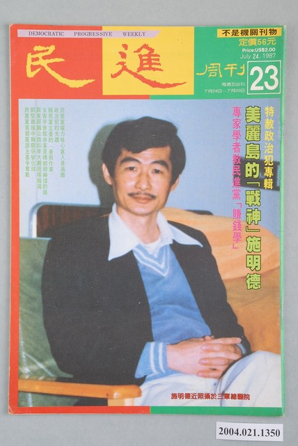 此為一紙質雜誌,此物件以相片(施明德近照攝於三軍總醫院)為封面,邊框為紅黃綠三色,並以黃、紅字體標示物件之名稱,本物件為1987年7月發行之《民進週刊》第23號,本期主題為「特赦政治犯專輯」,封面內容計有〈美麗島的「戰神」施明德〉、〈專家學者教民進黨「賺錢學」〉、〈民進黨權力核心進入風暴圈〉、〈政治犯的光譜〉、〈國民黨立委的「暑假作業」〉、〈女青年會館命案是總統媳婦擋的路〉、〈屏東屏鵝公路飆車大賽現場報導〉、〈鄒堅難接中韓關係變化球〉、〈民進黨首都黨部主委爭奪戰〉等。目錄計有(一)民進觀點、(1)換球員,不如換教練(蘇瑞)、(二)讀者進場編者候教、(1)皇上有旨,臣有所不受、(2)解嚴不只換制服、(3)政戰部在上,教育局不敢、(4)黨員相互來體諒、(5)民進黨應善謀「生財之道」、(三)封面故事•赦免政治犯專輯、(1)美麗島的「戰神」施明德(衛揚)、(2)做一個尊嚴的政治犯――施明德在監現況、(3)臺灣的政治犯族群(張無派)、(4)天涯猶有未歸人(艾翠)、(5)臺灣的三個人權組織、(四)蔣主席辦公室、(1)徐立德:東方禿鷹再現江湖、(2)蔣緯國為卅年代歷史翻案、(3)李煥上台,馬鎮方脫穎而出、(4)李煥旋風捲個不停、(5)鄒堅難接中韓關係變化球、(6)陳守山保不住警總臨聘人員、(7)女青年會館命案是總統媳婦擋的路、(8)吳伯雄將羅張列為「拒絕往來戶」、(五)民進青年、(1)十三所大專院校學生成立「大學法改革促進會」(陸平)、(六)向五一%邁進、(1)周滄淵運轉錢來也(劉一德)、(2)八路財神指點迷津――專家學者教民進黨「賺錢學」(林靜英)、(七)江主席辦公室、(1)民進黨權力核心進入暴風圈、(2)民進黨首都黨部主委爭奪戰、(3)台北市民進黨議會黨團隱憂重重、(4)民進黨將辦籌款餐會、(5)北美臺灣人教授協會近日組團返臺、(6)楊祖珺代夫上訴、(八)小鐮刀專欄、(1)大飯桶與小黨工(竹葉青)、(九)特別報導、(1)警總說:他是中暑死的(黃怡)、(2)誰來管流氓、(3)不知「悔改」,還想進來?――香港電影界人士對解嚴的期望(莫蝶)、(十)人生舞台、(1)快樂的飛車隊――屏東屏鵝公路飈車實況(莫蝶)、(十一)國會現形錄、(1)國民黨增額立委的「暑假作業」(林沖)、(2)國民黨立委的超級砲手(曾安) 等。 《民進周刊》為1987年2月19日創刊的黨外雜誌,創辦人為吳祥輝。此刊物曾陸續以《民進時代》、《民進廣場》、《民進天地》、《民進世界》等名稱出版,最終在1990年8月20日停刊。此刊物標榜「不是機關報」、「人民第一、民進黨第二」,另《民進周刊》雖然在政治立場與民進黨親近,所謂「黨外」為中國國民黨之外的政治勢力,「黨外」在國民黨政府的治下運用創辦雜誌的方式表達立場、對抗國民黨政府,這些雜誌、出版品被稱為「黨外雜誌」,《民進周刊》系列亦是其中之一。