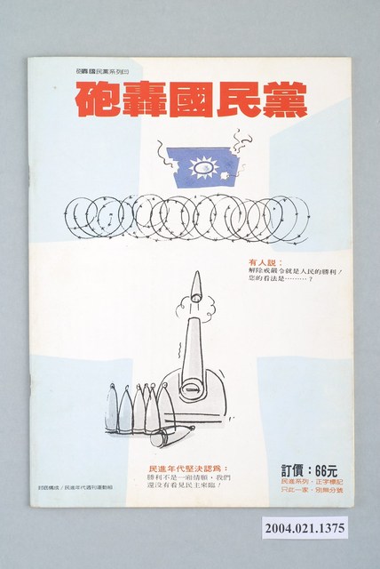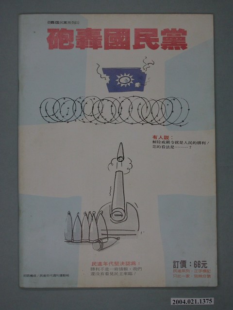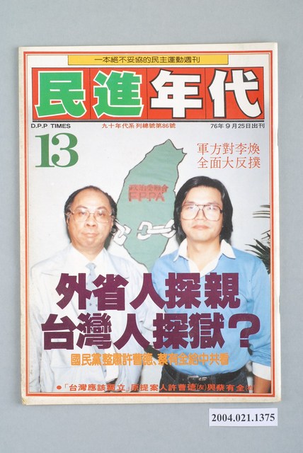 此為一紙質雜誌,此物件以相片(「臺灣應該獨立」原提案人許曹德(左)與蔡有全(右))為封面。本物件為1987年9月發行之《民進年代》週刊第13期(九十年代系列總號第86號),封面內容計有〈外省人探親 臺灣人探獄?――國民黨整肅許曹德、蔡有全給中共看〉、〈軍方對李煥全面大反撲〉等。目錄計有(一)最前線、(1)康寧祥不要亂搞!(蘇武)、(二)打開天窗說亮話、(1)軍人統治,滾蛋!(本社)、(三)民進新聞排行榜、(1)臺灣政治受難者聲援大會、(2)柯家聲被收押、(3)民進黨建黨週年慶辦遊行、(4)民進黨召開中執會、(四)我們的天空、(1)民進黨應成立「受難黨員關懷中心」、(2)不改選代表是社會禍源、(3)「民進年代」為何按兵不動?、(五)民進論壇、(1)臺灣的新十字架-掀開蔣經國的暗棋(陳慶順)、(六)特別企劃、(1)國安局暗示高檢處出擊(蘇武)、(2)軍方全面大反撲!-國民黨右翼力量抬頭的政治玄機(胡啓明)、(3)李煥政治大撤退-李慶華下台的政治玄機(吳志仁)、(4)李煥四面楚歌-國民黨軍政保守勢力全面撲殺改革派(韓光)、(5)李煥進退維谷(李木生)、(6)許歷農是郝柏村第二?(文劍雄)、(七)專題採訪、(1)臺灣人探獄,外省人探親?(林錦鍠)、(2)你獨立,我抓人-軍方動手干預「臺灣獨立運動」(獨笑天)、(3)永不後悔!-專訪許曹德談「臺灣應該獨立案」(范文雄)、(4)速寫許曹德、蔡有全(本社)、(5)不容司法破壞言論自由、(6)大家樂、炒股票與國民黨捉人(小K)、(7)國民黨亂開刀-專訪蔡有全談「臺灣應該獨立案」(兵介仕)、(8)國民黨關臺灣人給中共看(林水連)、(9)決戰前夕-相關人士談「臺灣應該獨立案」偵查意義、(八)社會批判、(1)時報週刊玩「大家樂」?(樂友)、(九)政治行情表、(1)軍方賭爛「國會助理聯誼會」-周書府替軍方出氣(吳自然)、(2)開放的大陸政策-國民黨引中共力量恫嚇民進黨(展鵬)、(十)新聞現場、(1)向新聞暴力宣戰-「912臺灣日報事件說明會」紀實(文劍雄)、(2)九-記台中市黨部成立大會(李梅金)、(十一)打帶跑、(1)革行政院的命(范道地)、(十二)抗議檔案、(1)張子源要我們露宿街頭!(柳葉)、(十三)民進藍圖、(1)朝平等獨立的外交邁進-談民進黨如何研訂大陸政策(宋必文)、(十四)陽光下、(1)中共與國民黨的瓦斯大戰、(2)朱士烈心灰意冷、(3)宋楚瑜暗助吳水雲、(4)姚舜靜極思動、(5)資深國代杯葛李煥、(6)菲律賓支持臺灣獨立?、(7)「警總收書隊」整編進各縣市政府、(十五)政治三分球、(1)主張臺獨有罪,實行臺獨無罪(周病) 等。 此件《民進年代》雜誌為系列黨外雜誌其中之一,該系列有《九十年代》、《民進年代》、《領先週刊》等週刊,《民進年代》為純粹為民進黨新聞服務的雜誌,並期許為民眾帶來平實、客觀的報導,雜誌社的成員也都是民進黨的青年黨工,與當時期出版的《民進週刊》一樣都與民進黨有著密切關係,但反對並批評《民進週刊》運用女星做宣傳的策略。《民進年代》對民進黨逐漸以公職掛帥並遠離群眾的路線有所批評。 「黨外」一詞主要為非中國國民黨的臺灣政治勢力,而「黨外」政治勢力,主要的宣傳方式為「黨外雜誌」,「黨外雜誌」最早如1950年代的《自由中國》、1970年代的《大學》、《臺灣政論》,後在1980年代「黨外雜誌」發展蓬勃,代表刊物為《八十年代》與《美麗島》,最終,這股媒體趨勢在1986年民進黨成立、1987年解除戒嚴之後逐漸式微。「黨外雜誌」在當時激起了臺灣民眾的民主意識,也逐步促成了言論自由開放。(蕭淑玲,2006,153-155)。