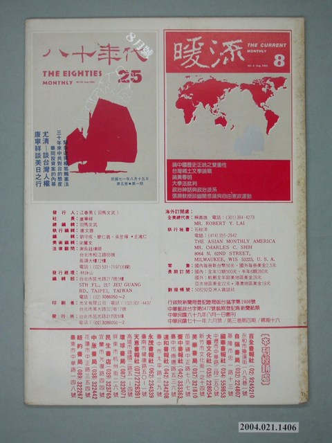 此為一紙質雜誌,此物件以紅、白色相間之亞洲地圖及銀色帆船之剪影為封面,並以白色字體標示物件之名稱,本物件為1982年9月發行之《亞洲人》月刊第3卷第4期(總號第16號),封面內容計有〈美國軍售臺灣的辯論〉、〈唇槍舌劍訪老康〉、〈王迎先能討回公道嗎?〉、〈紀政與沈君山的溝通〉、〈廖仲凱的生平〉等。目錄計有(一)社論、(1)論猶太人的團結、(二)編輯室筆記、(三)讀者投書、(四)目錄、(五)台北話題、(1)日本加強軍備、(2)監委看王迎先命案、(3)長老教會重申「人權宣言」的精神、(4)統戰中的筆戰、(5)誰在抗議日本竄改教科書、(6)黃年當採訪主任、(7)國民黨的內部批評、(8)教育部長的起訴書、(9)黨外雜誌掃瞄、(六)政治、(1)唇槍舌戰話臺灣――加州論壇報訪康寧祥(加州論壇報)、(2)紀政與沈君山的溝通(加州論壇報)、(3)民主化是臺灣唯一的希望――訪立法委員黃煌雄(吳重達)、(4)快樂的奴隸――政治操縱與個案分析(吳乃德)、(5)西藏人不要異族統治(蘇明輝)、(七)國防、(1)美國軍售臺灣的辯論(魏如風)、(2)聯合公報與臺灣(劉志傑)、(3)保衛大臺灣(編輯室)、(八)議會政治、(1)揭發省營事業的特權壟斷(凌嘉穗)、(九)法治、(1)人命換來的人權――五名警官被起訴有感(黃怡)、(2)大人啊,冤枉!――王迎先命案起訴有感(丁山雄)、(十)國際政情、(1)再見,貝魯特(陳季安)、(十一)黨外世界、(1)政治、財富、暴力結合的台北縣(金寶山)、(十二)歷史、(1)「微言大義」之爭――日本修改歷史教科書事件(周庚譯)、(2)廖仲愷生平及其死亡(葉知秋)、(十三)經濟、(1)「王、蔣大戰」戰不完(蘇軫)、(十四)農業、(1)今日臺灣農業問題(李宗藩)、(十五)地方小記、(1)民主選戰在風城(江水涵)、(十六)短評、(1)公務員˙颱風˙假(倪良光) 等。 此件《亞洲人》為康寧祥發行的《八十年代》雜誌的系列刊物之一,主要為接替《八十年代》而創刊,《八十年代》系列雜誌為臺灣黨外雜誌的重要代表,有「黨外雜誌編輯群的搖籃」之稱,由學者以及新聞界從事批判性的政論,與黃信介發行的《美麗島》雜誌成為「黨外政治」運動兩條路線各自的代表。所謂「黨外」為中國國民黨之外的政治勢力,「黨外」在國民黨政府的治下運用創辦雜誌的方式表達立場、對抗國民黨政府,這些雜誌、出版品被稱為「黨外雜誌」,《亞洲人》亦是其中之一。