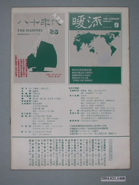 此為一紙質雜誌,此物件以綠、白色相間之亞洲地圖及銀色帆船之剪影為封面,並以白色字體標示物件之名稱,本物件為1982年10月發行之《亞洲人》月刊第3卷第5期(總號第17號),封面內容計有〈憲政主義的危機〉、〈「反攻無望論」事件〉、〈左舜生「治台方案」事件〉、〈「護憲與修憲」大論戰〉、〈「自由中國」事件到中美斷交〉、〈最後一關:臺灣關係法〉、〈「法統」的日趨凋零〉等。目錄計有(一)社論、(二)編輯室筆記、(三)目錄、(四)讀者投書、(五)台北話題、(1)周令飛爭奪戰、(2)郭新雨胡不歸?、(3)蔡維屏要下台?、(4)鄭余鎮不是林鈺祥、(5)尤清出國考察、(6)香港是臺灣的樣板?、(7)官員與立委演雙簧、(8)司馬文武應邀訪美、(六)本期專題、(1)憲政體制的危機、(2)康寧祥˙學者憲政體制對話(本社)、(3)從政府遷台到「護憲運動」(張夫之)、(4)從「自由中國」事件到中美斷交(胡志成)、(5)中美斷交後的內外併發症(劉志傑)、(七)議會政治、(1)中央侵權與地方護權(聞何)、(2)一問一答間˙玄機知多少?――省議會取消聯合質詢人限規定(宋德豪)、(八)政治、(1)林洋港式的「假平等」(江力誠)、(2)林洋港的民主法治觀(余子睿)、(3)「大官虎」的言論分寸(曾文溪)、(4)黨政分際的佈雷區(劉姥姥)、(5)釋放長期囚犯此其時矣(金生水)、(九)大家談、(1)國語歌仔戲不倫不類(李安和等)、(1.1)消滅台語的藉口、(1.2)硬要阿婆穿迷你裙、(1.3)耍猴子的作法太可笑、(1.4)成大事不拘小節、(1.5)給阿媽的一封信、(1.6)黨外數來寶、(十)地方小記、(1)噶瑪蘭的後代――宜蘭黨外生生不息(康文雄)、(十一)法治、(1)司法不可淪為政爭與貪污的工具――兼評中壢市長選舉訴訟的再審判決(唐建國)、(十二)選舉、(1)新竹選戰的回顧(金寶山)、(十三)人權、(1)誰在為王家辯護(江水涵)、(十四)短評、(1)誰該被調查?――駐基隆關調查員弊端重重(朱一明)、(2)給文化纏小腳――從孔子雕像的「標準化」談起(姜史)、(3)盜印猖獗誰之過?(吳法)、(4)正視「氰酸鉀」捕魚的禍害(蘇三妹)、(十五)教育、(1)缺點何時了?(胡基峻)、(十六)人物、(1)魯迅的孫子與著作(司馬文武)、(2)阿飛仔娶某(倪良光)、(十七)文藝、(1)奇文共賞、(1.1)鄧著:興漢尊者七年留言(柳木火)、(1.2)岳著:記蔣公兩項偉大偉略(張金水)、(2)動物與昆蟲緊急逮捕權――馬來西亞詩人拉惠德拉的抗議(凱撒)、(十八)國際、(1)再見,種族滅絕(辛巴達) 等。 此件《亞洲人》為康寧祥發行的《八十年代》雜誌的系列刊物之一,主要為接替《八十年代》而創刊,《八十年代》系列雜誌為臺灣黨外雜誌的重要代表,有「黨外雜誌編輯群的搖籃」之稱,由學者以及新聞界從事批判性的政論,與黃信介發行的《美麗島》雜誌成為「黨外政治」運動兩條路線各自的代表。所謂「黨外」為中國國民黨之外的政治勢力,「黨外」在國民黨政府的治下運用創辦雜誌的方式表達立場、對抗國民黨政府,這些雜誌、出版品被稱為「黨外雜誌」,《亞洲人》亦是其中之一。