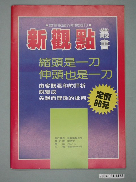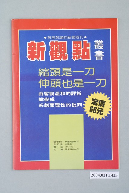 此為一紙質雜誌,在封面上方寫有本書標題,並在封面中節錄本刊物的部份內容,右下為雜誌期號,背面則刊有此雜誌的介紹以及相關出版資訊。此書為 新觀點週刊雜誌社1986年出版的《新觀點叢書》第3號。 此物件為在1986年創辦的《新觀點》系列雜誌其一,創辦人為陳世傑,為批判政府的黨外雜誌其一,此雜誌目的是要興辦突破戒嚴的言論審查、貫徹言論自由,並如同該刊物的創辦語「縮頭是一刀,伸頭也是一刀」的覺悟敢論敢言。此雜誌的特色為陳水扁每期皆為其撰寫社論,而陳水扁為臺灣近代社會運動的重要人物之一,以美麗島大審的辯護律師發跡,並在「蓬萊島案」及一系列的事件中扶搖直上,並先後擔任立法委員、臺北市長及中華民國第10、11任總統。後因貪汙案導致陳水扁入獄。 「黨外」一詞主要為非中國國民黨的臺灣政治勢力,而「黨外」政治勢力,主要的宣傳方式為「黨外雜誌」,「黨外雜誌」最早如1950年代的《自由中國》、1970年代的《大學》、《臺灣政論》,後在1980年代「黨外雜誌」發展蓬勃,代表刊物為《八十年代》與《美麗島》,最終,這股媒體趨勢在1986年民進黨成立、1987年解除戒嚴之後逐漸式微。「黨外雜誌」在當時激起了臺灣民眾的民主意識,也逐步促成了言論自由開放。(蕭淑玲,2006,153-155)。