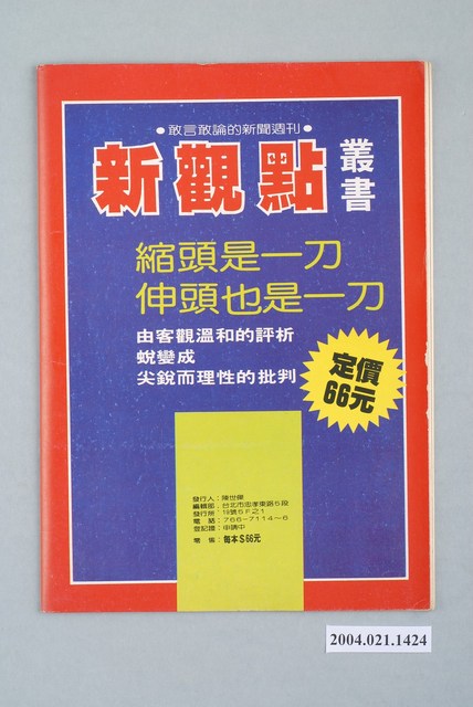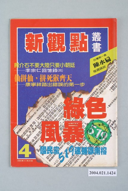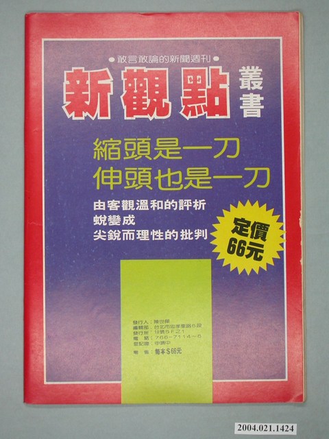 此為一紙質雜誌,在封面上方寫有本書標題,並在封面以燒破的痕跡坐為封面設計,並節錄本刊物的部份內容,左下為雜誌期號,背面則刊有此雜誌的介紹以及相關出版資訊。此書為 新觀點週刊雜誌社1986年出版的《新觀點叢書》第4號。 此物件為在1986年創辦的《新觀點》系列雜誌其一,創辦人為陳世傑,為批判政府的黨外雜誌其一,此雜誌目的是要興辦突破戒嚴的言論審查、貫徹言論自由,並如同該刊物的創辦語「縮頭是一刀,伸頭也是一刀」的覺悟敢論敢言。此雜誌的特色為陳水扁每期皆為其撰寫社論,而陳水扁為臺灣近代社會運動的重要人物之一,以美麗島大審的辯護律師發跡,並在「蓬萊島案」及一系列的事件中扶搖直上,並先後擔任立法委員、臺北市長及中華民國第10、11任總統。後因貪汙案導致陳水扁入獄。 「黨外」一詞主要為非中國國民黨的臺灣政治勢力,而「黨外」政治勢力,主要的宣傳方式為「黨外雜誌」,「黨外雜誌」最早如1950年代的《自由中國》、1970年代的《大學》、《臺灣政論》,後在1980年代「黨外雜誌」發展蓬勃,代表刊物為《八十年代》與《美麗島》,最終,這股媒體趨勢在1986年民進黨成立、1987年解除戒嚴之後逐漸式微。「黨外雜誌」在當時激起了臺灣民眾的民主意識,也逐步促成了言論自由開放。(蕭淑玲,2006,153-155)。