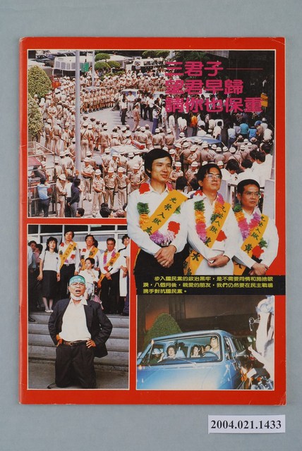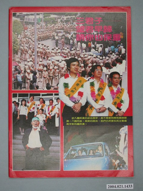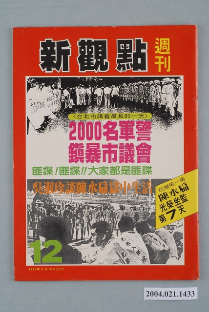 此為一紙質雜誌,在封面上方寫有本書標題,並在封面刊有群眾抗議以及靜坐的照片,並節錄本刊物的部份內容,左下為雜誌期號,背面則刊有時稱「蓬萊島三君子」的陳水扁、黃天福、李逸祥入獄前的活動照片。此書為新觀點週刊雜誌社1986年出版的《新觀點週刊》第12號。 此物件為在1986年創辦的《新觀點》系列雜誌其一,創辦人為陳世傑,為批判政府的黨外雜誌其一,此雜誌目的是要興辦突破戒嚴的言論審查、貫徹言論自由,並如同該刊物的創辦語「縮頭是一刀,伸頭也是一刀」的覺悟敢論敢言。此雜誌的特色為陳水扁每期皆為其撰寫社論,而陳水扁為臺灣近代社會運動的重要人物之一,以美麗島大審的辯護律師發跡,並在「蓬萊島案」及一系列的事件中扶搖直上,並先後擔任立法委員、臺北市長及中華民國第10、11任總統。後因貪汙案導致陳水扁入獄。 「黨外」一詞主要為非中國國民黨的臺灣政治勢力,而「黨外」政治勢力,主要的宣傳方式為「黨外雜誌」,「黨外雜誌」最早如1950年代的《自由中國》、1970年代的《大學》、《臺灣政論》,後在1980年代「黨外雜誌」發展蓬勃,代表刊物為《八十年代》與《美麗島》,最終,這股媒體趨勢在1986年民進黨成立、1987年解除戒嚴之後逐漸式微。「黨外雜誌」在當時激起了臺灣民眾的民主意識,也逐步促成了言論自由開放。(蕭淑玲,2006,153-155)。