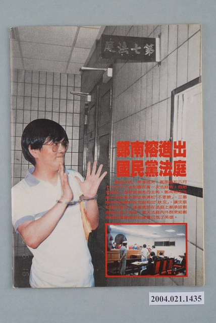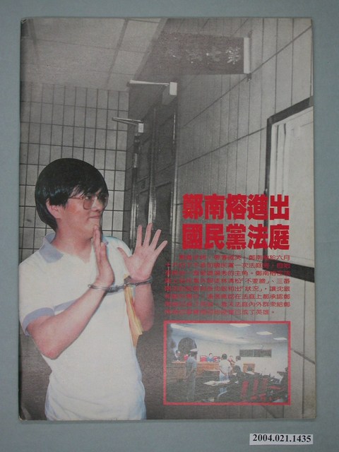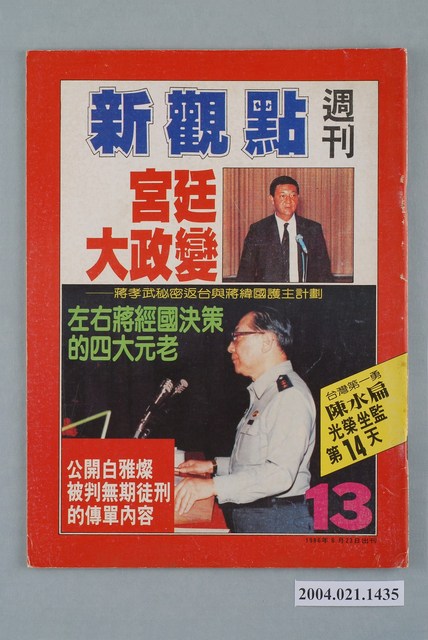 此為一紙質雜誌,在封面上方寫有本書標題,並在封面刊有蔣孝武與蔣緯國的照片,並節錄本刊物的部份內容,右下為雜誌期號,背面則刊鄭楠榕被捕的照片。此書為新觀點週刊雜誌社1986年出版的《新觀點週刊》第13號。 此物件為在1986年創辦的《新觀點》系列雜誌其一,創辦人為陳世傑,為批判政府的黨外雜誌其一,此雜誌目的是要興辦突破戒嚴的言論審查、貫徹言論自由,並如同該刊物的創辦語「縮頭是一刀,伸頭也是一刀」的覺悟敢論敢言。此雜誌的特色為陳水扁每期皆為其撰寫社論,而陳水扁為臺灣近代社會運動的重要人物之一,以美麗島大審的辯護律師發跡,並在「蓬萊島案」及一系列的事件中扶搖直上,並先後擔任立法委員、臺北市長及中華民國第10、11任總統。後因貪汙案導致陳水扁入獄。 「黨外」一詞主要為非中國國民黨的臺灣政治勢力,而「黨外」政治勢力,主要的宣傳方式為「黨外雜誌」,「黨外雜誌」最早如1950年代的《自由中國》、1970年代的《大學》、《臺灣政論》,後在1980年代「黨外雜誌」發展蓬勃,代表刊物為《八十年代》與《美麗島》,最終,這股媒體趨勢在1986年民進黨成立、1987年解除戒嚴之後逐漸式微。「黨外雜誌」在當時激起了臺灣民眾的民主意識,也逐步促成了言論自由開放。(蕭淑玲,2006,153-155)。