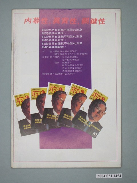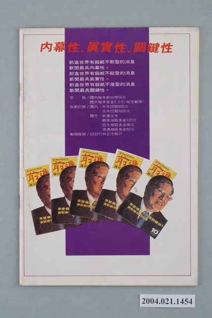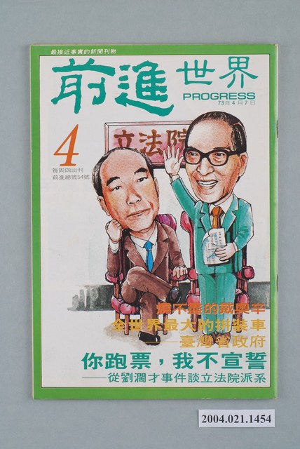 此為一紙質雜誌,此物件以插圖為封面,並以綠色字體標示物件之名稱,本物件為1984年4月發行之《前進世界》週刊第4期(前進總號第54號),封面內容計有〈燒不盡的戴奧辛〉、〈全世界最大的拼裝車――臺灣省政府〉、〈你跑票,我不宣誓――從劉濶才世界談立法院派系〉等。目錄計有(一)吾土吾民、(1)封面裡:燒不盡的戴奧辛、(2)封底裡:臺灣勞工法律支援會成立、(二)封面故事、(1)你跑票,我不宣誓――立法院派系放鴿計(陳山天)、(2)劉濶才小傳(魯凡)、(3)狗咬自己的尾巴――立法院的派系鬥爭(韓倚)、(三)特別報導➀、(1)人民中毒,王家受益――誰從「戴奧辛」公害獲利?(鐵山)、(2)燒不盡的戴奧辛――公害大事記(紅薯)、(四)特別報導➁、(1)全世界最大的拼裝車:臺灣省政府――這棟超級政治違建是應該拆除了!(黃森松)、(2)掀起妳的蓋頭來――臺灣省歷任行政院長官大觀(謝洋輝)、(五)專題、(1)地下經濟是寶貝,地上經濟是暴君――經濟替代的種子在地下(侯立朝)、(六)熱門話題、(1)滿街都是神經病――從螢橋國小悲劇事件談起(楚如風)、(2)新竹市長補選前夕風雲錄(姜逢春)、(3)二二八事件不能談嗎?(文也多)、(4)「黨外編輯作家聯誼會、(5)六個委員會開始運作(江長嘯)、(6)大台北瓦斯加空氣,建設局長更漏氣(高次山)、(7)他們為什麼拒絕鑑定證據?――陳水扁談張銘傳案現況(曾心儀記錄)、(七)前進論壇、(1)黨外必須以「民主運動」為主導――傳遞一個訊息➂(林波海)、(2)臺灣黨外路線之爭的翻版――菲律賓大選前的反對派情勢(江城)、(3)在亞洲建立一個更平等與更公平的社會(李光耀)、(八)本周之最、(九)首都別記、(1)蔣彥士舉止透露玄機、(2)蔣彥士的「寡人之疾」、(3)搬風移位看誰家、(4)權力鬥爭暗中較勁、(5)亞洲商報向陳鼓應道歉、(十)大城小調、(1)臺灣年代畢業專輯、(2)新聞處再度查禁小型影院、(3)臺灣文藝辦文藝營、(4)陳家為陳文成掃墓、(5)高雄黨外欲成立聯合服務處、(6)「王滿慶子女教育基金會」成立、(十一)外國月亮、(1)如臨大敵的奧運會籌備會、(2)馬可仕終於「流血」了、(3)強盜劫掠監獄強盜犯、(4)美國社會的「驕子」――雅比族、(5)砲聲中的薩國大選、(十二)新聞穿梆、(1)省政府是姨太太、(2)聯合報畫餅充飢、(3)聯合報替觀中護航、(4)中央日報露玄機、(5)禁子牢頭發脾氣、(十三)讀者來函、(1)打開天窗說亮話 等。 此物件為林正杰創辦的《前進》雜誌系列出版品之一,為黨外政論雜誌,曾受國民黨政府查禁,並陸續更改刊名,計有《前進周刊》、《前進廣場》、《前進時代》、《前進世界》等。《前進》雜誌標榜「在報禁下尋找更接近真實的客觀報導」,其重要創辦人有林正杰、蔡式淵、蔡仁堅,三人皆為民進黨早期派系「前進系」成員。所謂「黨外」為中國國民黨之外的政治勢力,「黨外」在國民黨政府的治下運用創辦雜誌的方式表達立場、對抗國民黨政府,這些雜誌、出版品被稱為「黨外雜誌」,《前進》系列亦是其中之一。