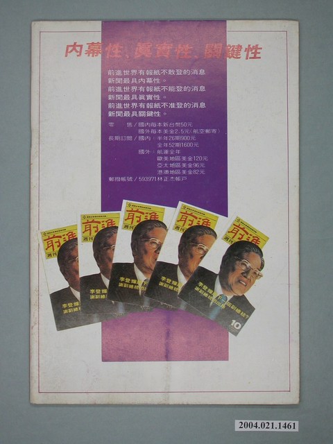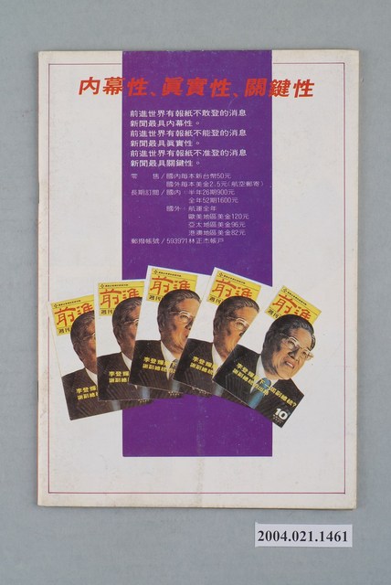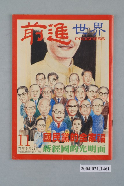 此為一紙質雜誌,此物件以插圖為封面,並以紅、紫色字體標示物件之名稱,本物件為1984年5月發行之《前進世界》週刊第11期(前進總號第61號),封面內容計有〈國民黨的全家福〉、〈蔣經國的光明面〉等。目錄計有(一)、封面故事、(1)國民黨的全家福(本刊資料室)、(2)蔣總統的最高指示(梅渴望恭錄眉批)、(3)蔣經國的光明面(高菲)、(二)特別報導、(1)郭麗莉為六千萬登報道歉?-「吞金」官司捉放曹壽美內幕(陳昆村)、(三)熱門話題、(1)國民黨要在臺大收復失土、(2)、五朝天子一朝臣-台北市動物園園長王光平的苦經(陳必勝)(3)許水德決策能力打五十九分-高雄市政建設重重危機(馬非白)、(4)藍炎祥朝俞內閣開槍-高雄槍戰是色情問題的危險訊號(知山)、(5)道德的人與不道德的政治-陳秋山「死諫」的警惕(高次山)、(6)人性世界的邊緣-華西街見聞(江城)、(7)趙耀東挑起新聞戰(姜逢春)、(8)臺灣黑獄風雲(李木木)、(9)菲律賓人民審判馬克仕-國會大選反對派獲重大勝利(王開)、(10)光州精神永不死!-韓國光州事件四周年展開大規模紀念示威遊行(張王開)、(11)看世界如何致力殺人(胡志拓譯)、(12)黨外最終要做的是什麼?-傳達一個訊息(五)(林波海)、(四)本周之最、(五)首都別記、(1)魏鏞將引發政治風暴、(2)朱匯森要蔣彥士拉他一把、(3)立委、黨官向俞國華大獻殷勤、(4)「國際筆會」關懷坐監作家魏京生、(5)義光教會舉行平安祈禱會、(6)對警總五月十五日聲明的三點答覆、(7)高俊明獲贈神學博士、(8)台北拉攏達賴喇嘛、(六)大城小調、(1)警總豐收,雜誌遭殃、(2)施家班又出奇招、(3)政論週刊陸續誕生、(4)高雄黨外進行內部檢討、(七)外國月亮、(1)蘇聯以牙還牙的強硬作風、(2)華勒沙與艾頓約翰相見恨晚、(3)大陸、臺灣的「經濟結晶」、(4)英國情報員吃裡扒外、(5)英國工聯干涉太陽報片編務、(八)新聞穿梆、(1)聯合報的「獨家新聞」、(2)經濟成長率大家吹、(3)兩大報的宣傳手法、(4)臺灣離婚率誇張得離譜、(九)讀者來函、(1)人民有權知道「不妥言論」的權利 等。 此物件為林正杰創辦的《前進》雜誌系列出版品之一,為黨外政論雜誌,曾受國民黨政府查禁,並陸續更改刊名,計有《前進周刊》、《前進廣場》、《前進時代》、《前進世界》等。《前進》雜誌標榜「在報禁下尋找更接近真實的客觀報導」,其重要創辦人有林正杰、蔡式淵、蔡仁堅,三人皆為民進黨早期派系「前進系」成員。所謂「黨外」為中國國民黨之外的政治勢力,「黨外」在國民黨政府的治下運用創辦雜誌的方式表達立場、對抗國民黨政府,這些雜誌、出版品被稱為「黨外雜誌」,《前進》系列亦是其中之一。