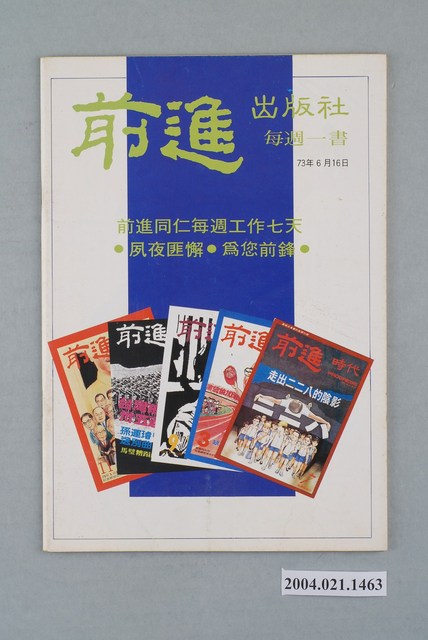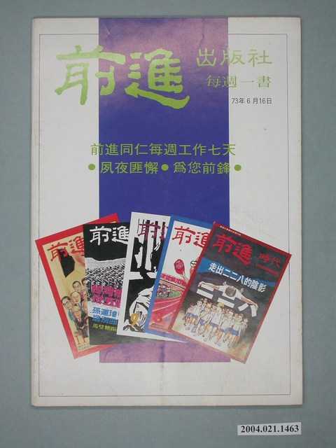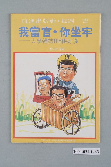 此為一紙質刊物,此物件以插圖為封面,並以紫色字體標示物件之名稱,本物件為1984年6月發行之「前進雜誌社•每週一書」(前進總號第64號),書名為《我當官•你坐牢――大學雜誌108條好漢》,林正杰等著。目錄計有(一)、封面故事、(1)張寶樹與大學集團-拿槍的與拿筆的面對面(林正杰)、(2)我當官˙你坐牢-《大學》集團一百零八條好漢(水情專家)、(3)蔣經國愛看大學雜誌社出版《訪陳鼓應(周元璋)、(4)七○年代的孟嘗君-《大學雜誌》總管理張紹文(葉鴻英)、(5)黨外人士要多讀書-訪丘宏達(周元璋)、(6)青年才俊被逼上梁山-訪劉福增(王水水)、(7)當年的包青天-訪包奕洪(王水水)、(8)昨日之怒-《大學雜誌》菁英的談話片斷(本刊編輯部)、(二)特別報導:泰福閣之風波、(1)「我的媽媽王玉雲」-聽聽許昆龍說些甚麼(姚國建)、(2)槍口下的小百合-許昆龍口述泰福閣餐廳槍擊案始末(姚國建整理)、(3)爸爸請您也保重-許瑞娥給父親許昆龍的一封信(許瑞娥)、(三)前進論壇、(1)山胞籲天錄-記胡德夫一個有關山胞的演講(程香整理)、(2)遊牧民族的悲歌?-好茶村個案調查(洪田俊報告/程香整理)、(3)大水沖倒龍王廟,當然不賠?-六三水災引發的保險問題(張晉城)、(4)決戰的時刻到了!-勉勞工代表及黨外立委(江長嘯)、(5)看風城˙竟是誰家天下?-新竹市長補選選情分析(李木木)、(6)共軍的元帥爭奪戰(本刊編輯組)、(四)傳達一個訊息➇、(1)為什麼統一?為什麼臺獨?(林波海)、(五)本周之最、(六)首都別記、(1)宋時選志在中央黨部秘書長、(2)俞國華的宮廷派頭、(3)謝東閔的剩餘價值、(4)美國大選國民黨花錢、(5)林義雄歸期難料、(6)香港中大成立「海峽兩岸比較研究會」、(七)前進一一九、(1)安全人員不安全、(2)級任導師的心聲、(3)建國中學開牆做生意、(4)不要吸家長的血汗錢、(5)笑死孔老夫子、(6)工友代課、(八)黨外頻道、(1)林濁水、陳水扁即將赴美、(2)康寧祥將赴美進修、(3)張博雅訪美、(4)紀萬生帶傷出獄、(5)新潮流出版創刊號、(6)施性忠轎車被砸、(7)李旺台離開台時、(8)黨外動態數則、(九)外國月亮、(1)令人害怕的雷根武裝侍衛、(2)西班牙人民要求脫離北大西洋公約組織、(3)先進國巨頭大拜拜、(4)新加坡政府的優生學、(十)環球一週、(十一)讀者來函、(1)海外聲援絕食活動見聞、(2)臺灣人權協會來函、(3)官僚的校長、教官、(十二)前進之聲 等。 此物件為林正杰創辦的《前進》雜誌系列出版品之一,為黨外政論雜誌,曾受國民黨政府查禁,並陸續更改刊名,計有《前進周刊》、《前進廣場》、《前進時代》、《前進世界》等。《前進》雜誌標榜「在報禁下尋找更接近真實的客觀報導」,其重要創辦人有林正杰、蔡式淵、蔡仁堅,三人皆為民進黨早期派系「前進系」成員。所謂「黨外」為中國國民黨之外的政治勢力,「黨外」在國民黨政府的治下運用創辦雜誌的方式表達立場、對抗國民黨政府,這些雜誌、出版品被稱為「黨外雜誌」,《前進》系列亦是其中之一。