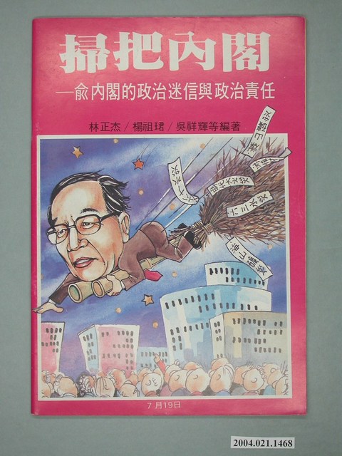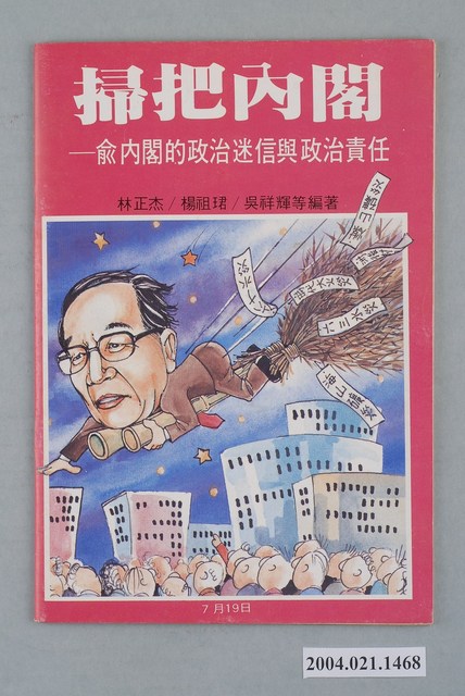 此為一紙質刊物,此物件以插圖為封面,並以白色字體標示物件之名稱,本物件為1984年7月發行之「前進雜誌社•每週一書」,書名為《掃把內閣――兪內閣的政治迷信與政治責任》,林正杰、楊祖珺、吳祥輝等編著。目錄計有(一)封面故事、(1)掃把內閣威信掃地-從政治迷信及政治責任談俞內閣(李木木)、(2)臺灣第一龜縮-邱創煥-算算邱創煥的總帳(谷陽)、(3)承天意、罵皇帝-政治迷信的哲學基礎(春秋筆)、(4)有所變-災變-國民黨的政治迷信(黎普)、(二)海外文摘、(1)癌症病房-香港-香港意見領袖李怡訪問記(作者:新井一二三/譯者:逸文)、(三)前進論壇、(1)傅建中的色情外交(他K)、(2)「華僑精神」搞飛機(大K)、(3)誰敢惹我爸爸-警總北警部司令錢懷瑜為兒子護航(古仁義)、(4)圓滿背後的時代悲劇-評「老莫的第二個春天」(陳不進)、(5)國民黨和中共的夾心餅干-許鞍華(李靜靜)、(6)國家公墓沒有竊聽器-笑話五則(托斯基)、(7)許昆龍煽情?徐德煽火?(周全)、(8)龍潭鄉民怒吼了!-淨士保衛戰的第一波(宋祥)、(9)金牌元老放逐阿根廷-台時元老閔天官的來信(閔天官)、(10)日本銀行趕搭臺灣巴士(王開)、(四)熱門話題、(1)誰將礦工集體謀殺?(林天紅)、(2)礦工,你只有等死!(黃明珠)、(五)獨家報導、(1)楊金欉不來電!-台北市區內的「難民營」(陳近南)、(2)只怪當初瞎了眼(小梁) 等。 此物件為林正杰創辦的《前進》雜誌系列出版品之一,為黨外政論雜誌,曾受國民黨政府查禁,並陸續更改刊名,計有《前進周刊》、《前進廣場》、《前進時代》、《前進世界》等。《前進》雜誌標榜「在報禁下尋找更接近真實的客觀報導」,其重要創辦人有林正杰、蔡式淵、蔡仁堅,三人皆為民進黨早期派系「前進系」成員。所謂「黨外」為中國國民黨之外的政治勢力,「黨外」在國民黨政府的治下運用創辦雜誌的方式表達立場、對抗國民黨政府,這些雜誌、出版品被稱為「黨外雜誌」,《前進》系列亦是其中之一。