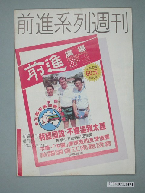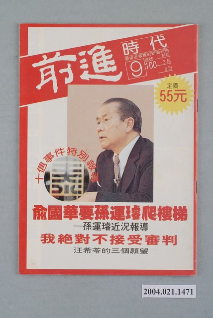 此為一紙質雜誌,此物件以白色為底,中央置有照片,並以白色字體標示物件之名稱,本物件為1985年3月發行之《前進時代》週刊第9期(總號第100號),封面內容計有〈十信事件特別報導〉、〈兪國華要孫運璿爬樓梯――孫運璿近況報導〉、〈我絕對不接受審判――汪希苓的三個願望〉等。目錄計有(一)前進第一百期出刊感言(編輯部)、(二)封面故事、(1)俞國華要孫運璿爬樓梯-孫運璿的近況報導(水情專家)、(2)動輒得咎,閉門謝客-孫運璿家人慎懼交遊(鍾紅楚)、(三)前進論壇、(1)勝利是不可取代的-黨外應成熟、進取(吳哲明)、(四)獨家報導、(1)我們要記住-今天是二月二十八日-鍾理和未發表的幾頁日記(鍾理和)、(2)犧牲的血不會白流(楚楚)、(五)熱門話題、(1)蔡辰洲「食信」而垮-十信弊案概記(辛聞)、(2)討債是示威˙人權是叛亂-十信示威與美麗島遊行(葉雙秋)、(3)門不當˙戶不對的三人行-蔣彥士、關中與蔡辰洲(郭軍)、(六)特別報導、(1)苦痛純真的鮮明砲手-一九八三、八四臺灣詩選(本刊)、(2)如果詩壇像大植物園-於吳晟、苦苓談一九八三、八四臺灣詩選(浮志萍)、(七)前進報導、(1)我不接受公開審判-汪希苓的三個願望(火情專家)、(2)政治干涉司法˙司法強姦學術-蓬萊島案二審開庭(楚楚)、(3)老共脫帽!-大陸文壇春天似乎來臨(莊英村)、(4)大學之盜-東海大學以黑掃黑(顧力康)、(5)金山不再是美麗的故鄉-中金嚴重污染金山鄉(沈襄)、(6)從腐敗到美好-令人同情的大陸留日學生(王開)、(八)本週之最、(九)前進之聲、(十)黨外頻道、(十一)首都別記、(1)沒有證據如何判罪(2)徐立德可能栽在「十信」危機之下、(3)張京育搞砸了俞國華的年終記者會、(4)統戰刊物也過不了關中共查禁《台聲雜誌》、(5)戴崇慶說:我早已金盆洗手、(十二)海外與大陸、(1)中(共)美軍事會議內容外洩、(2)中國大陸的「孔子熱」、(3)中(共)、泰加強軍事合作、(4)臺灣與大陸去年貿易額創新紀錄、(5)解放軍淘汰百萬名軍中老幹部、(十三)一九八五年前進讀者問卷調查、(十四)外國月亮、(1)伊朗鼓勵寡婦再婚、(2)美國大兵有「美夢」?、(3)波蘭「江南」案後的政府報復行動、(4)金大中接受《亞洲週刊》訪問 等。 此物件為林正杰創辦的《前進》雜誌系列出版品之一,為黨外政論雜誌,曾受國民黨政府查禁,並陸續更改刊名,計有《前進周刊》、《前進廣場》、《前進時代》、《前進世界》等。《前進》雜誌標榜「在報禁下尋找更接近真實的客觀報導」,其重要創辦人有林正杰、蔡式淵、蔡仁堅,三人皆為民進黨早期派系「前進系」成員。所謂「黨外」為中國國民黨之外的政治勢力,「黨外」在國民黨政府的治下運用創辦雜誌的方式表達立場、對抗國民黨政府,這些雜誌、出版品被稱為「黨外雜誌」,《前進》系列亦是其中之一。