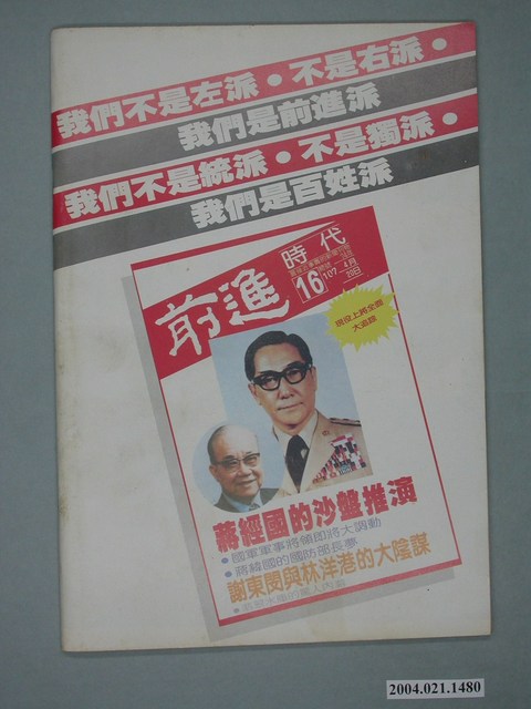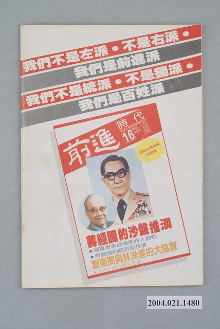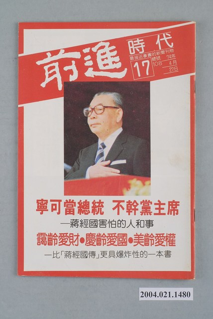 此為一紙質雜誌,此物件以白色為底,中央置有照片,並以白色字體標示物件之名稱,本物件為1985年4月發行之《前進時代》週刊第17期(總號第108號),內容計有〈寧可當總統,不幹黨主席――蔣經國害怕的人和事〉、〈靄齡愛才•慶齡愛國•美玲愛權――比「蔣經國傳」更具爆炸性的一本書〉等。目錄計有(一)封面故事、(1)寧可當總統,不幹黨主席-蔣經國害怕的人和事(水情專家)、(2)沒本錢,就不要上牌桌-嚴家淦最怕什麼?(火情專家)、(二)海外文摘、(1)他們都是賊!-宋王朝的歷史會不會在臺灣重演?(彭文逸)、(2)靄齡愛財、慶齡愛國、美齡愛權-評「宋家王朝」(林行止)、(3)中共公然威脅武力攻台-中共提出「臺灣在未來的十年」論文(王金芸)、(4)在舊金山訪陶百川先生-評中共威脅武力攻台(陸鏗)、(三)前進報導、(1)施明德最新的體檢表(蔡龍居)、(2)吾愛市長,吾更愛市民-台北市七位黨外市議員拒絕質詢始末(江寧靜)、(3)為救「兄弟」,不擇手段-斥「世界日報」利用「白狼」和「背影」蒙騙讀者(董狐筆)、(4)將軍,不要哭(廖莫白)、(5)總統怕怕-阿根廷文人政府大審三名前總統、九名總司令(費台民)、(6)大學生!民眾正注視著你們!-美國大學校園展開大規模的新學運(楚天)、(7)無能卻要核能-比較臺灣的原子能委員會與美國的NRC(林俊義)、(8)台電胡說,臺灣人胡塗-駁斥台電所謂的專家之言(梁朵)、(9)警察總按幾次鈴(梁朵)、(10)適之,敖之,祥之-《李敖評傳札記》下期聯連載(穿梆先生)、(11)電影界的「革命黨」-推展平民電影運動的「四○○擊」電影雜誌(莊英村)、(12)請投下神聖的一張電影票-訪詹宏志談臺灣新電影(梁春幼)、(四)特別報導、(1)活的「王迎先」-梅述宗遭刑求案件自殺(楚楚)、(2)老兵余新民依叛亂罪嫌遭偵訊(本刊)、(3)美國華埠聲援余新民(逢雨新)、(4)大嘉一起來刑求-台北市的刑求案件(唐堂)、(五)本週之最、(六)前進之聲、(七)首都別記、(1)「金鴻輪」被扣,交通部頭痛、(2)關中封殺立委年底競選縣長、(3)華航賠錢,空中小姐陪酒、(4)海峽兩岸將舉行徵兵大競賽、(5)輿論「聯合抱」核四廠的大腿、(八)黨外頻道、(九)假如你有三百元、(十)海外與大陸、(1)國民黨在香港低聲下氣、(2)傳鄧小平將退出軍委會、(3)大陸色情錄影帶氾濫、(4)各類職業薪資的行情、(十一)外國月亮、(1)「四海一家」引起美國社會同情心、(2)雷根訪歐計畫外一章、(3)高棉反越派避難泰棉邊界、(4)韓國民主促進協議會發表五點聲明 等。 此物件為林正杰創辦的《前進》雜誌系列出版品之一,為黨外政論雜誌,曾受國民黨政府查禁,並陸續更改刊名,計有《前進周刊》、《前進廣場》、《前進時代》、《前進世界》等。《前進》雜誌標榜「在報禁下尋找更接近真實的客觀報導」,其重要創辦人有林正杰、蔡式淵、蔡仁堅,三人皆為民進黨早期派系「前進系」成員。所謂「黨外」為中國國民黨之外的政治勢力,「黨外」在國民黨政府的治下運用創辦雜誌的方式表達立場、對抗國民黨政府,這些雜誌、出版品被稱為「黨外雜誌」,《前進》系列亦是其中之一。