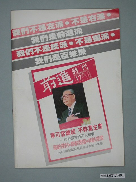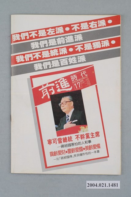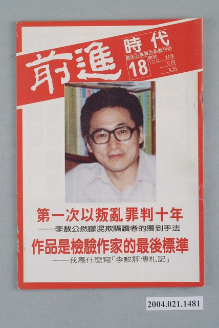 此為一紙質雜誌,此物件以白色為底,中央置有照片,並以白色字體標示物件之名稱,本物件為1985年5月發行之《前進時代》週刊第18期(總號第109號),封面內容計有〈第一次以叛亂罪判十年――李敖公然矇混欺騙讀者的獨到手法〉、〈作品是檢驗作家的最後標準――我為什麼寫「李敖評傳札記」〉等。目錄計有(一)封面故事、(1)作品是檢驗作家的最後標準-我為什麼寫「李敖評傳札記」(吳祥輝)、(2)第一次以叛亂罪判十年-李敖公然矇混讀者的高超手法(吳祥輝)、(二)前進報導、(1)林德顯北被離奇收押禁見(本刊)、(2)天下豈有不打人的警察-大安分局趕上求熱潮(平平)、(3)黨人逝去天邊,黨棍盡在眼前-余井塘簡傳(黃慶華)、(4)黃季陸一生坎坷(陳小凡)、(5)「失蹤」的公園-台北市七號公園預定地的「多方面」用途(辛聞)、(6)戰鬥筆團選前大檢閱-國民黨刊物總曝光(陳懇)、(7)絕食抗議在綠島不是新聞-白雅燦的絕食紀錄(逢雨新)、(8)勞基法併發症-勞基法實施後資方的脫法手段(林天紅)、(9)從「第一代勞工」到「第二代勞工」-簡記蕭新煌、徐正光兩教授的「五一勞動節」演講(沈襄)、(10)戴國煇的震盪-超越殖民地的經驗(南方朔)、(11)為什麼要感謝日本人?-戴國煇的「臺灣史研究」摘要(本刊編輯部)、(三)前進論壇、(1)臺灣的悲哀,悲哀的臺灣-臺灣「法西斯化」的危機(嚴志桐)、(四)特別報導、(1)個個似鷹犬,本本皆辛苦-警總「中興專案」進入新的雷霆階段(莊英村)、(2)鐵蹄直搗黨外雜誌社出版《「薪火」被抄現場記(朱自河)、(五)本週之最、(六)前進之聲、(七)首都別記、(1)內閣可能將於六月全面改組、(2)宋楚瑜新闢「辦公室」、(3)海峽兩岸統戰競技、(4)臺大「普選案」獲通過、(5)賴文良獄中被毆致死案開庭、(6)四旅美臺灣人社團譴責國府逮捕老兵余新民、(7)梅述宗最新狀況報導、(8)考試院「中醫師特考洩題案」調查「憂然而止」、(八)假如你有三百元、(九)黨外頻道、(十)海外與大陸、(1)北京公車司機發動「慢班」抗議、(2)上海南京路是年輕人的世界、(3)「恭喜發財」春聯又見流行、(4)稀少動物「中國雪豹」遭竊獵、(十一)外國月亮、(1)泰國的應召女朗選美、(2)十六歲的黎巴嫩自殺女隊員、(3)昔日老兵重聚易北河判、(4)余契爾夫人一出門就出紕漏、(5)FDN處決人犯秘密照片公開 等。 此物件為林正杰創辦的《前進》雜誌系列出版品之一,為黨外政論雜誌,曾受國民黨政府查禁,並陸續更改刊名,計有《前進周刊》、《前進廣場》、《前進時代》、《前進世界》等。《前進》雜誌標榜「在報禁下尋找更接近真實的客觀報導」,其重要創辦人有林正杰、蔡式淵、蔡仁堅,三人皆為民進黨早期派系「前進系」成員。所謂「黨外」為中國國民黨之外的政治勢力,「黨外」在國民黨政府的治下運用創辦雜誌的方式表達立場、對抗國民黨政府,這些雜誌、出版品被稱為「黨外雜誌」,《前進》系列亦是其中之一。