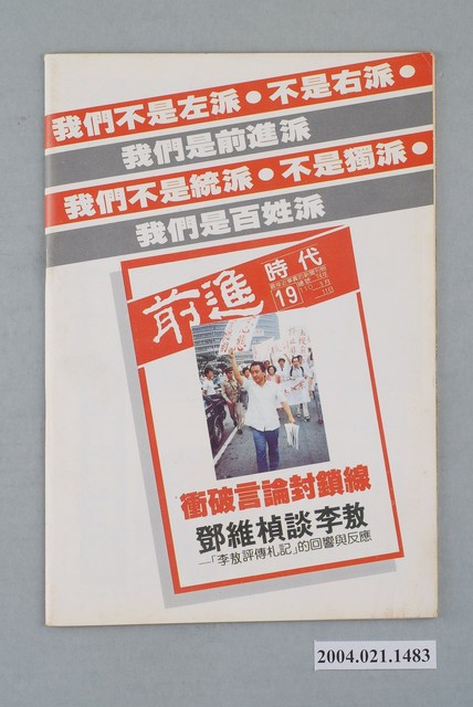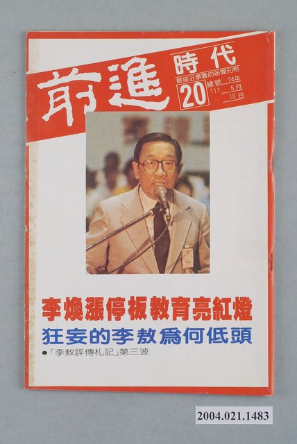 此為一紙質雜誌,此物件以白色為底,中央置有照片,並以白色字體標示物件之名稱,本物件為1985年5月發行之《前進時代》週刊第20期(總號第111號),封面內容計有〈李煥漲停板教育亮紅燈〉、〈狂妄的李敖為何低頭――「李敖評傳札記」第三波〉等。目錄計有(一)封面故事、(1)搶戲份,爭排名的政治演員-李煥比俞國華更風光(朱步昇)、(2)傳聞李煥可能出任行政院長(管清風)、(3)歷任教育部長考(本刊編輯部)、(4)是教務部長,不是教育家-李煥應當勇敢面對教育難題(莊英村)、(5)教育部該做的事太多了!-林玉體教授對李煥的兩項建言(江衍樁)、(二)《李敖評傳札記》、(1)狂妄的李敖為何低頭-李敖向沈之岳大送秋波的白紙黑字和往事(吳祥輝)、(2)李敖大師會不會是上「馬陵道」?-《李敖評傳札記》的迴響與反應(吳祥輝)、(三)前進報導、(1)十四名黨外省議員集體辭職抗議(唐堂)、(2)綠島驚傳大暴動(朱靖原)、(3)施明德的最後假期(平平)、(4)先生該講話了!-康寧祥在青商會演講(蔣化)、(5)國安會才是幕後主角-副秘書長親自執行「中興專案」(楚楚)、(6)不是起點,更沒有終點-臺大「普選案」終獲通過(張元村)、(7)講究「禮貌」的學生運動-美國大學學生運動的今與昔(吳向前)、(8)黨團舞劍,一意在「尤清」-監察院企圖限制自動調查的真相(莊英村)、(9)李國鼎、俞國華是被改革者-王作榮的話中有話(郭紀)、(10)美國將是明日的「貧戶」-解析當前美國的經濟危機(王開譯自日本《廿一世紀》)、(四)、特別報導(1)無聲砲火下的文學交流-海峽兩岸作家與作品的接觸(本刊)、(2)作品愈多人讀愈好!(梁春幼)、(3)面具遠離!帽子遠離!-流沙河的《臺灣詩人十二家》(文華)、(五)人物專訪、(1)擺脫貴族外衣的醫師-施明德私人醫師蔡龍居默默耕耘(陳懇)、(六)本週之最、(七)前進之聲、(八)黨外頻道、(九)首都別記、(1)中央黨部為「才」而「財」而頭大、(2)黨部假「母親節」大肆招兵買馬、(3)立法院通過「可恥預算」、(4)林鈺祥、鍾榮吉昇官案擱淺、(5)張一中說:十信案的調查有高元首指導施、(6)施性忠遷戶籍,臺南市恐慌、(7)黃榮秋退出新竹市長選舉、(十)海外與大陸、(1)香港英資企業開始「捲舖蓋」(2)大陸建「抗日戰爭紀念館」、(3)最古老人類遺跡出土、(4)新加坡與中共交流日趨緊密(5)中共擬定新「大學聯考保送辦法」、(十一)外國月亮、(1)「哭泣女士」為艾奎諾案出庭作證、(2)黎巴嫩回教民兵的「為國鋤奸」行動、(3)美蘇兩國漁夫和衷共濟、(4)北韓用日貨南韓表憤慨、(5)純金佛像五.五噸 等。 此物件為林正杰創辦的《前進》雜誌系列出版品之一,為黨外政論雜誌,曾受國民黨政府查禁,並陸續更改刊名,計有《前進周刊》、《前進廣場》、《前進時代》、《前進世界》等。《前進》雜誌標榜「在報禁下尋找更接近真實的客觀報導」,其重要創辦人有林正杰、蔡式淵、蔡仁堅,三人皆為民進黨早期派系「前進系」成員。所謂「黨外」為中國國民黨之外的政治勢力,「黨外」在國民黨政府的治下運用創辦雜誌的方式表達立場、對抗國民黨政府,這些雜誌、出版品被稱為「黨外雜誌」,《前進》系列亦是其中之一。