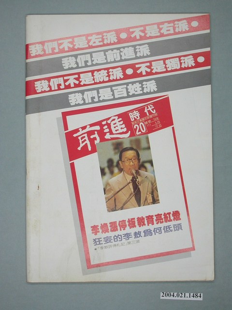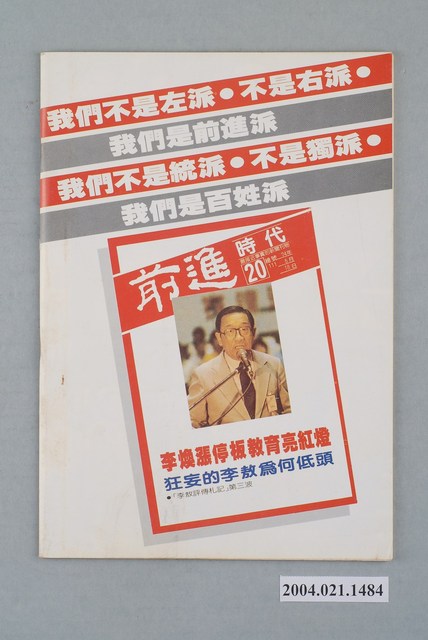 此為一紙質雜誌,此物件以白色為底,中央置有插圖,並以白色字體標示物件之名稱,本物件為1985年5月發行之《前進時代》週刊第21期(總號第112號),封面內容計有〈黨外需要一個最高決策機構――黨外議會?黨外中常會?黨外一級團體?黨外聯盟?〉、〈李敖的第一個老闆――「漢奸」陶希聖:李敖的靠行及反噬心態〉等。目錄計有(一)封面故事、(1)黨外需要一個最高決策機構-黨外會議?黨外中常會?黨外一級團體?黨外聯盟?(本刊)、(二)《李敖評傳札記》、(1)李敖的第一個老闆-「漢奸」陶希聖-李敖的靠行及反噬心態(上)(吳祥輝)、(2)他不是胡秋原-李敖學術詐欺的例子之一(吳祥輝)、(3)「武林大俠」的「凱子理論」-《李敖評傳札記》的迴響與反應(三)(吳祥輝)、(三)特別報導、(1)「宋王朝」作者避居國外-蔣宋美齡遇壽,此書掃興(陸鏗)、(2)說服力與敗筆-胡菊人評七所長反駁「宋家王朝」(胡菊人)、(3)黎東方為何不說真的故事-評黎東方的「像一個喝醉的水手」(郭紀)、(4)學術碰野史反抬身價-胡菊人再評七所長反駁「宋家王朝」(胡菊人)、(四)、前進報導(1)向「俞」前進-許水德走俞夫人路線,國民黨員輕蔑蘇南成(臺大年)、(2)不准黨外辦通訊社-《環球新聞》通訊社遭停刊處分(朱自河)、(3)辭一次,不辭兩次-黨外省議員總辭始末(陳懇)、(4)嫁給臺灣的女孩-懷念推動黨外新生代的陳菊(李惠如)、(5)讓黨外組黨-黃華決定絕食一年的兩大心願(平平)、(6)人道關懷重於一切-海外同鄉對於施明德絕食的聲援(本刊駐美特派員周元璋)、(7)台中的「戒嚴日」-許、尤服務處秘書被警方打傷(楚楚)、(8)天妬英才與天棄英才-國民黨醜化黨外的伎倆(管清風)、(9)從「青山綠水」到「燈紅酒綠」-簡介陳秀惠「山地妓女問題研究」(知山)、(10)香港贏球,北平暴動(逢雨新)、(11)客家人多出聞名之士-中共開放廣東梅縣觀光(王開)、(五)讀者與《前進》、(1)《前進》一九八五年問卷調查報告(本刊編輯部)、(2)希望與努力-楊祖珺談《前進》一九八五年問卷調查(本刊)、(六)本週之最、(七)前進之聲、(八)黨外頻道、(九)首都別記、(1)立法院又傳「鼓噪」事件、(2)立法院刪除新聞稿內情、(3)「國軍文藝活動中心」大火,情治人員懷疑為分歧份子所為、(4)文工會與「民眾日報」協調、(5)陸潤康「置之死地而後生」、(6)陳進興頗讓立委黨部頭痛、(7)編聯會甄選「一九八四黨外文選」、(8)余新民家屬陷困境、(十)外國月亮、(1)越戰遺恨老兵傷神、(2)未成功的「江南」、(3)比金家族的新希望、(4)韓國大學生紀念光州事件、(5)哈特是「短命」的英雄、(十一)海外與大陸、(1)李鴻章手跡公開於世(2)迪斯可舞成為中國體育課程、(3)新型帳蓬將取代「蒙古包」、(4)摹古的歌舞團(5)「萬元戶」賭博被判重刑、(6)六歲「神童」劉小斌、(7)拒載短程的計程車 等。 此物件為林正杰創辦的《前進》雜誌系列出版品之一,為黨外政論雜誌,曾受國民黨政府查禁,並陸續更改刊名,計有《前進周刊》、《前進廣場》、《前進時代》、《前進世界》等。《前進》雜誌標榜「在報禁下尋找更接近真實的客觀報導」,其重要創辦人有林正杰、蔡式淵、蔡仁堅,三人皆為民進黨早期派系「前進系」成員。所謂「黨外」為中國國民黨之外的政治勢力,「黨外」在國民黨政府的治下運用創辦雜誌的方式表達立場、對抗國民黨政府,這些雜誌、出版品被稱為「黨外雜誌」,《前進》系列亦是其中之一。