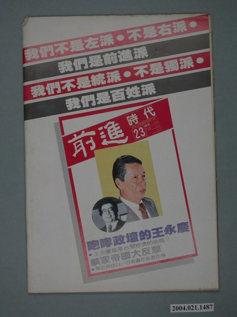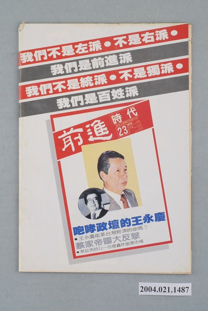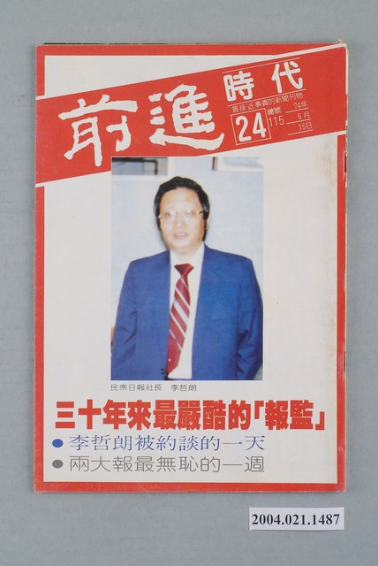 此為一紙質雜誌,此物件以白色為底,中央置有照片(民眾日報社長李哲朗),並以白色字體標示物件之名稱,本物件為1985年6月發行之《前進時代》週刊第24期(總號第115號),封面內容計有〈三十年來最嚴酷的「報監」〉、〈李哲朗被約談的一天〉、〈兩大報最無恥的一週〉等。目錄計有(一)封面故事、(1)報館社長被警總約談-民眾日報社長李哲朗被約談的一天(水情專家)、(2)李哲朗的心聲(本刊編輯部)、(3)老陌沒有春天,老姚的第二個春天-民眾日報鐵三角(林清)、(4)你辦報,我不放心-從光復迫害到現在的報業血淚(莊英村)、(5)黑派軍師、大將發表聲明支援民眾日報(蘇錫輝、吳大清)、(6)台權會對民眾日報停刊事件的聲明(本刊整理)、(7)李哲朗被「留社察看」-民眾日報被停刊一週的前因後果(魯客)、(8)軍人也反對戒嚴-三十名前國軍將領建議政府取消戒嚴令(江百合)、(二)熱門話題(1)兩大報最無恥的一週-聯合中時公開叫罵、大打出手(逢雨新)、(2)誰是老大?(顏芬亭)、(三)海外文摘、(1)用自己的資本做別人的生意-從七位所長的廣告說起(彭文逸)、(四)前進報導、(1)李國鼎傳將接任閣揆?(鍾紅楚)、(2)陳菊,我們敬愛妳,想念妳-缺席的壽星(王水水)、(3)黃信介奔父喪,大批警力維持秩序(林碩彥)、(4)懷念唐文標(陳映真)、(5)關中說大話,施金協開支票-邱創煥胡說八道,宋楚瑜置身事外(蕭友友)、(6)一群不受歡迎的尖兵(陳懇)、(7)「西」人「屋」簷下,國民黨低頭-西屋公司的無窮後患(馬非白)、(8)人人皆可謂流氓-檢肅流氓條例,將危害人權自由(唐堂)、(9)一清流氓,二清良民(楚楚)、(五)人物專訪、(1)沒有「青年節」的人-專訪畫家吳耀忠(江衍樁)、(六)《李敖評傳札記》、(1)就教於所有的李敖迷-《李敖評傳札記》的回響與反應之六(吳祥輝)、(七)本週之最、(八)前進之聲、(九)黨外頻道、(十)首都別記、(1)國民黨成立中央文宣辦公室、(2)財政部所得稅修法正案曝光、(3)軍中詩人將掌國文天地、(4)沈光秀拍賣龍旗、(5)徐楓被軍方擺了一道、(6)吳大清要與「臺灣年代」劃清界線、(十一)外國月亮、(1)韓國大學生將集體起訴、(2)雷根吻妻,卡特慢跑、(3)黛安娜出現夢露鏡頭、(4)密特朗欲力挽狂瀾、(十二)海外大陸、(1)台美文化交流中心正式成立(2)大陸又開始尊孔、(3)大陸軍隊要清一色、(4)大陸將於新加坡舉辦商務會議、(5)趙紫陽拜訪李約瑟博士、(6)「海峽兩岸交流會」在洛杉磯成立、(7)中共大興鐵路幹線 等。 此物件為林正杰創辦的《前進》雜誌系列出版品之一,為黨外政論雜誌,曾受國民黨政府查禁,並陸續更改刊名,計有《前進周刊》、《前進廣場》、《前進時代》、《前進世界》等。《前進》雜誌標榜「在報禁下尋找更接近真實的客觀報導」,其重要創辦人有林正杰、蔡式淵、蔡仁堅,三人皆為民進黨早期派系「前進系」成員。所謂「黨外」為中國國民黨之外的政治勢力,「黨外」在國民黨政府的治下運用創辦雜誌的方式表達立場、對抗國民黨政府,這些雜誌、出版品被稱為「黨外雜誌」,《前進》系列亦是其中之一。