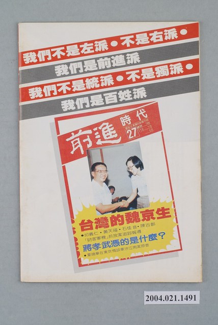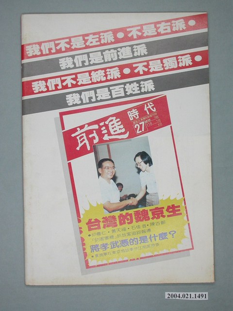此為一紙質雜誌,此物件以白色為底,中央置有照片,並以白色字體標示物件之名稱,本物件為1985年7月發行之《前進時代》週刊第28期(總號第119號),封面內容計有〈施性忠的坐牢五願――民主尚未成功•新竹市民仍須努力〉、〈蔣經國情人的生前死後――章孝嚴•章孝慈的母親章亞若的故事〉等。目錄計有(一)封面故事、(1)施性忠的坐牢五願-施性忠被強行逮捕前後(黃正元)、(2)蘭花市長-新竹代市長陳正雄其人其事(莊英村)、(二)海外文摘、(1)蔣經國情人的生前死後-章孝嚴章孝慈的母親章亞若的故事(汪婷章)、(2)鄧小平虎口拔牙-鄧小平為趙紫陽、胡耀邦裁軍(陸鏗)、(三)特別報導、(1)康寧祥要和中共談判什麼?七月七日《朝日新聞》國際版頭條的震撼(矢口一郎,寄自東京)、(2)長城的蹲式廁所,台北的抽水馬桶,瑞典的人廢臘腸,美國的馬桶合眾國-抽水馬桶的沉思(任覺民)、(四)前進報導、(1)最會娶太太的人-遠航總經理胡侗清(程功)、(2)黨外雜誌絕地大反攻第一波-蓄勢待發的「八一七請願運動」(逢雨新)、(3)台共統獨大會師-記「臺灣民主運動支援會」第五屆夏令營(陳國坤)、(4)李怡反擊《龍旗》的襲擊(本刊編輯部)、(5)陳映真主持,馬樹禮止步-「七七抗日紀念會」的幕前幕後(林朝慶)、(6)立法院是山大王法院-周慕文的舊醜新糗(朱懷)、(7)警察的尚方寶劍-「動員戡亂時期檢肅流氓條例」逐條解析(陳墾)、(8)智慧財產槓上開花-著作權法修正草案三讀通過的憂與喜(梁春幼)、(9)謊言包不住大火-核三廠大火燒出的種種問題(李炎)、(五)人物專訪、(1)帶兵難,當工頭更難-專訪臺北市環保局局長胡養才(楚楚)、(2)妾身待扶正,君心知我心?-環保局員工對胡養才的寄望(平平)、(六)本週之最、(七)前進之聲、(八)黨外頻道、(九)首都別記、(1)立法院強行表決通過「檢肅流氓條例」、(2)立法院預算委員會偷渡國營事業預算、(3)施明雄的五點聲明、(4)蔡李美靈判六月,余登發不服、(5)「軍司法審判的分際與人權」座談會、(十)外國月亮(1)西德禁戴假面具參加示威遊行、(2)墜落的「克宮新星」、(3)「傭兵學校」訓練錫克教徒、(4)世界最古老木乃伊公開展示、(5)小甘地,你怎麼不笑、(6)新式武器競賽、(十一)海外與大陸、(1)中共女館長、日本天皇的「親密關係」、(2)諸葛孔明直系子孫揮毫自如、(3)北京電台播放抗日影片、(4)中共加入太空事業、(5)法國「東方快車」長征北京、(6)中共四個現代化推倒舊法國俱樂部 等。 此物件為林正杰創辦的《前進》雜誌系列出版品之一,為黨外政論雜誌,曾受國民黨政府查禁,並陸續更改刊名,計有《前進周刊》、《前進廣場》、《前進時代》、《前進世界》等。《前進》雜誌標榜「在報禁下尋找更接近真實的客觀報導」,其重要創辦人有林正杰、蔡式淵、蔡仁堅,三人皆為民進黨早期派系「前進系」成員。所謂「黨外」為中國國民黨之外的政治勢力,「黨外」在國民黨政府的治下運用創辦雜誌的方式表達立場、對抗國民黨政府,這些雜誌、出版品被稱為「黨外雜誌」,《前進》系列亦是其中之一。