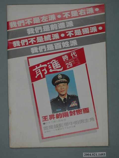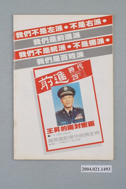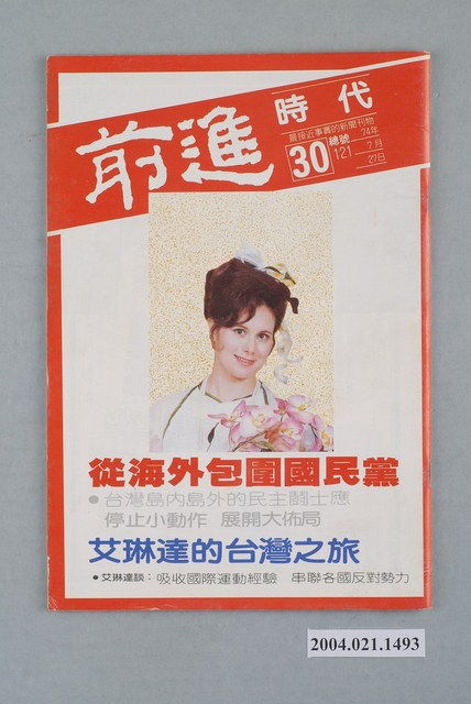 此為一紙質雜誌,此物件以白色為底,中央置有照片,並以白色字體標示物件之名稱,本物件為1985年7月發行之《前進時代》週刊第30期(總號第121號),封面內容計有〈從海外包圍國民黨――臺灣島內島外的民主闘士應停止小動作展開大佈局〉、〈艾琳達的臺灣之旅――艾琳達談:吸收國際運動經驗串聯各國反對勢力〉等。目錄計有(一)封面故事、(1)臺獨聯盟總體戰大出擊-臺獨聯盟與美國臺灣人團體的分合與較勁(辛聞)、(2)再造黨外民主運動-尊重民族立場,異中求同(艾琳達)、(3)艾琳達的臺灣之旅-艾琳達談臺灣黨外民主運動的過去與未來(林正杰)、(二)熱門話題-核能問題再追蹤、(1)我來自核電廠-核三廠事故之分析與憂慮(某工程師)、(2)到台電當官-絕對安全,借錢給台電-絕對安全-從核三大火看台電受制於外人(馬非白)、(3)浩劫邊緣的小城故事-恒春的最後一夜(姚國建)、(三)前進報導、(1)拍馬屁,拍到監獄-「一人黨魁」徐肇宏(蔣小胡)、(2)南韓需要中共-日本在野黨為南韓與中共鋪路(郭紀)、(3)美蘇兩國海外軍立佈置圖(本刊)、(4)美國在世界各地的「民間調查局」-臺灣的美國民間調查局局長是史東參議員(王開譯)、(5)內政部「荒唐」了事,蘇南成固若金湯-蘇南成大破一級國寶(李炎)、(6)奴工的兄弟,雛妓的故鄉-臺灣原住民-記原住民七二三請願(王水水)、(四)特別報導、(1)賺了錢就逃-世界各國逃稅經(王雨軒)、(2)大江東去浪淘盡數千億新台幣(楚楚)、(五)人物專訪、(1)高中退學˙大學死當,漫畫情不了-專訪魚夫的漫畫歷程(夏瑜)、(六)本週之最、(七)前進之聲、(八)黨外頻道、(九)首都別記、(1)國建會開鑼,「基本國策」派上場、(2)祝基瀅的學問和道德、(3)立委黃玉明吃不完兜著走、(4)國防部鼓勵逃避兵役?、(十)外國月亮、(1)日本政務次長的「暑期戰鬥營」、(2)一萬兩千人的世界婦女會議、(3)「新可口可樂」終於征服美利堅、(4)教師榮膺太空梭第一位平民代表、(5)南非種族隔離政策在美國、(6)菲律賓人絕食抗議、(十一)海外與大陸(1)白樺退伍,致力於專心寫作、(2)偷偷摸摸的香港基本法、(3)胡耀邦的女兒借花獻佛、(4)中共越南蘇聯三角關係日漸活絡、(5)中共發現唐朝石窟 等。 此物件為林正杰創辦的《前進》雜誌系列出版品之一,為黨外政論雜誌,曾受國民黨政府查禁,並陸續更改刊名,計有《前進周刊》、《前進廣場》、《前進時代》、《前進世界》等。《前進》雜誌標榜「在報禁下尋找更接近真實的客觀報導」,其重要創辦人有林正杰、蔡式淵、蔡仁堅,三人皆為民進黨早期派系「前進系」成員。所謂「黨外」為中國國民黨之外的政治勢力,「黨外」在國民黨政府的治下運用創辦雜誌的方式表達立場、對抗國民黨政府,這些雜誌、出版品被稱為「黨外雜誌」,《前進》系列亦是其中之一。