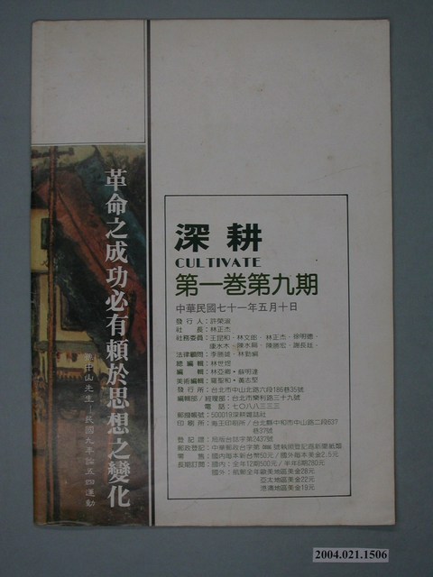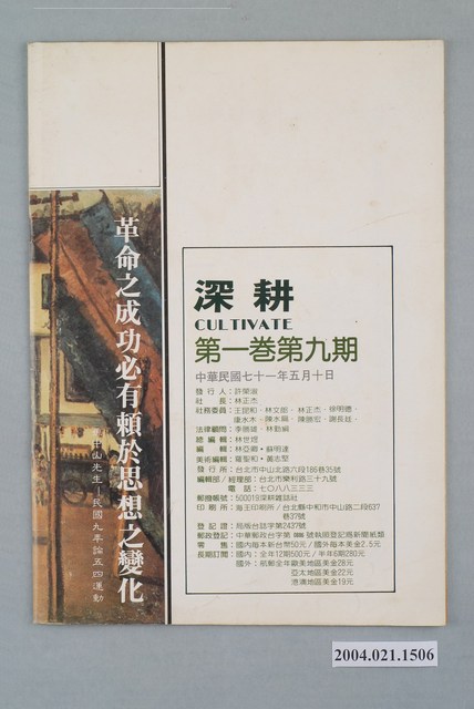 此為一紙質雜誌,此物件以白色為底,以畫作為封面,並以褐色字體標示物件之名稱,本物件為1982年5月發行之《深耕》半月刊第9期(總號第1卷第9期),封面內容計有〈特別報導――楊金欉首遇黨外八金鋼〉、〈即刻停止圍剿陶百川先生〉、〈給秦孝儀先生上一課〉(李敖)、〈再出發的黨外〉(陳若曦)、〈王永慶開野鷄車公司〉等。目錄計有(一)封面、(1)嘉義街心(陳澄波)、(二)五四感言(本社)、(三)即刻停止圍剿陶百川先生(本社)、(四)問政議壇、(1)楊金欉首遇黨外八金鋼-記一場精采的政治對話(蘇明達)、(2)查禁雜誌對話錄(蘇格拉底)、(3)請從速保障勞動者的基本生存權(許榮淑)、(4)冷眼看六呆公司(黃長)、(5)與徐明德談台北市議會政治(黃蓉)、(五)黨外政論、(1)給秦孝儀先生上一課(李敖)、(2)臺灣地方派系的危機-社會變遷中地方派系的生存、挑戰與結局(吳乃德)、(六)黨外.黨外(本社)、(七)生活與政治、(1)再出發的黨外(陳若曦)、(2)流浪兒的故事(徐榮淑)、(3)誰是黨內?誰是黨外?-黨外的邏輯遊戲(蔡式淵)、(八)國際觀察、(1)福克蘭事件中的英阿國內情形(陳萍)、(2)密特朗會成戴高樂第二?(舒怡民)、(九)找黨外求公道、(1)公道何在?(翁明志)、(2)校園裏應避免政治干擾(林景風)、(十)鄉土與人民、(1)監獄、心境、畫(蘇治芬)、(2)祝賀顏尹謨先生畫展(陳映真)、(十一)特別報導、(1)王永慶開野雞車公司?-長庚醫院司機集體怠工內幕(林可幸)、(十二)漫畫(PIC) 等。 此件為《深耕》雜誌的系列刊物之一,《深耕》為1981年由黃石城創辦的黨外政論雜誌,後交由許榮淑經營,主要主筆人包含林正杰、林世煜、林濁水等,其中內容包括編輯手記、國會趨勢、選舉與黨外動向、生活與政治、鄉土人物、藝文、漫畫等等。《深耕》曾在1982年對於「杯葛事件」中的部分黨外立委進行批判,並引起當時黨外勢力的對立。所謂「黨外」為中國國民黨之外的政治勢力,「黨外」在國民黨政府的治下運用創辦雜誌的方式表達立場、對抗國民黨政府,這些雜誌、出版品被稱為「黨外雜誌」,《深耕》系列亦是其中之一。