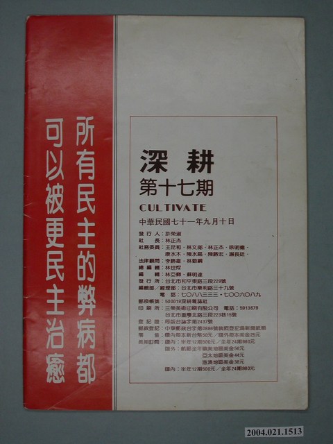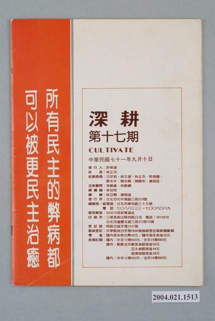 此為一紙質雜誌,此物件以畫作為封面,並以白色字體標示物件之名稱,本物件為1982年9月發行之《深耕》半月刊第17期(總號第17期),封面內容計有〈專題研究――黨外運動的目標與路線〉等。目錄計有(一)封面、(1)青年伯君(邱亞才)、(二)地下室手記(編輯部)、(三)讀者投書、(四)黨外運動的目標與路線、(1)黨外運動的目標與路線(張明雄)、(2)再就教於諸位黨外先進-反省幾個困擾黨外同仁的問題(林世煜)、(3)激進的政治路線與理性批判(鍾進)、(4)政治結社自由,體制內改革與正常民主(黃怡)、(5)體制與改革(吳怡法)、(6)打破幻想與奢望(林亞卿)、(7)黨外應繼續向前邁進-鄧維楨談康寧祥(于凡)、(8)黨外生命的實質意義在那裏(蘇治芬)、(五)黨外政論、(1)重視新的研究取向-談「理性,法律和道德」(林明宏)、(2)讓國民黨頭痛醫頭、腳痛醫腳吧!-從本省縣市長及省議會選舉歷史看基層選舉的存廢(黃維祥)、(六)政策研究、(1)診斷南臺灣發展的命脈(一)-南部區域縣市發展座談會摘記(蕭平)、(七)生活與政治、(1)「蕭竊組式偵訊」實況報導(劉怡然)、(2)新約教會、錫安聖山、小林河灘-謹以此文表明我們的遭遇和心聲(陳忠成)、(八)國際觀察、(1)巴勒斯坦問題知多少?(一)(高伊哥)、(九)人權通訊、(1)埃及:吟唱詩人的悲哀和希望(吳乃德)、(十)鄉土.人物.文化、(1)臺灣武裝抗日秘史(七)(廖祖堯譯)、(十一)、(1)漫畫(PIC) 等。 此件為《深耕》雜誌的系列刊物之一,《深耕》為1981年由黃石城創辦的黨外政論雜誌,後交由許榮淑經營,主要主筆人包含林正杰、林世煜、林濁水等,其中內容包括編輯手記、國會趨勢、選舉與黨外動向、生活與政治、鄉土人物、藝文、漫畫等等。《深耕》曾在1982年對於「杯葛事件」中的部分黨外立委進行批判,並引起當時黨外勢力的對立。所謂「黨外」為中國國民黨之外的政治勢力,「黨外」在國民黨政府的治下運用創辦雜誌的方式表達立場、對抗國民黨政府,這些雜誌、出版品被稱為「黨外雜誌」,《深耕》系列亦是其中之一。
