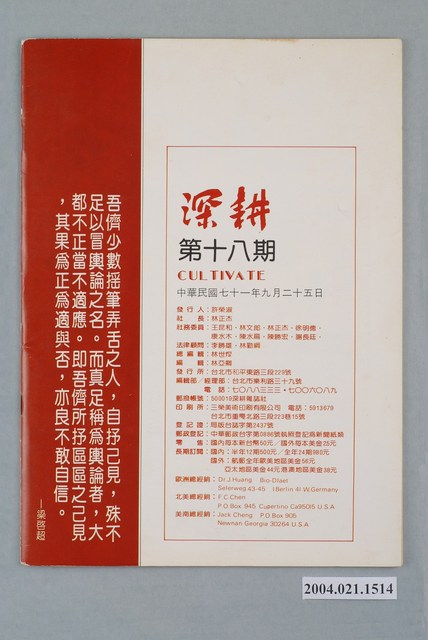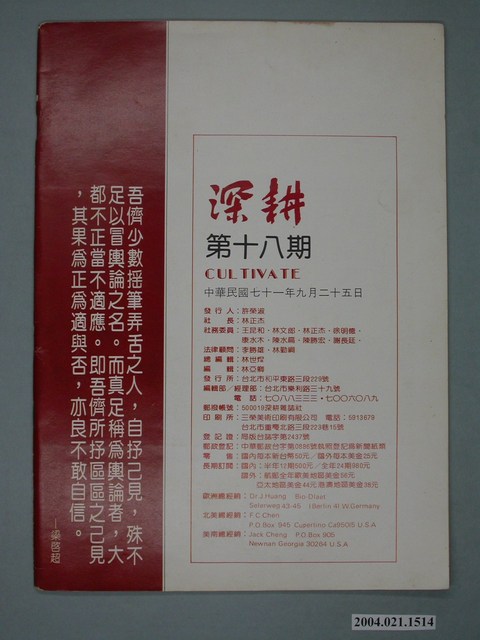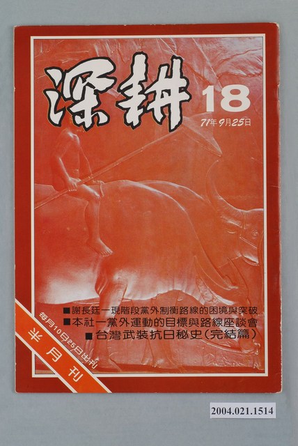 此為一紙質雜誌,此物件以畫作為封面,並以白色字體標示物件之名稱,本物件為1982年9月發行之《深耕》半月刊第18期(總號第18期),封面內容計有〈現階段黨外制衡路線的困境與突破〉(謝長廷)、〈黨外運動的目標與路線座談會〉(本社)、〈臺灣武裝抗日秘史(完結篇)〉等。目錄計有(一)封面、(1)水牛羣像(1930)(黃水土)、(二)地下室手記(本社)、(三)讀者投書(本社)、(四)黨外運動的目標與路線、(1)黨外運動的目標與路線座談會(本社)、(2)現階段黨外制衡路線的困境與突破(謝長廷)、(3)蔣渭水.林獻堂.辜顯榮-試論黨外民主運動今後可行的方向(陽嘯瀛)、(4)拆穿聯合報的謊言(本社)、(五)問政議壇、(1)把話說在前頭-第四屆台北市議會第二次大會前瞻(吳輕然)、(六)政策研究、(1)診斷南臺灣發展的命脈(二)-南部區域縣市發展座談會摘記(蕭平)、(七)生活與政治、(1)臺灣「之乎者也」(李興)、(2)總動員法下的報禁(邢良)、(3)幫財閥賺黑錢的財政部(陳琪祥)、(4)對當前經濟政策的思考(何文振)、(5)破壞「國運」的海關(林風林)、(八)國際觀察、(1)巴勒斯坦問題知多少?(二)(高伊哥)、(九)鄉土.人物.文化、(1)臺灣武裝抗日秘史(完結篇)(廖祖堯)、(十)漫畫(PIC) 等。 此件為《深耕》雜誌的系列刊物之一,《深耕》為1981年由黃石城創辦的黨外政論雜誌,後交由許榮淑經營,主要主筆人包含林正杰、林世煜、林濁水等,其中內容包括編輯手記、國會趨勢、選舉與黨外動向、生活與政治、鄉土人物、藝文、漫畫等等。《深耕》曾在1982年對於「杯葛事件」中的部分黨外立委進行批判,並引起當時黨外勢力的對立。所謂「黨外」為中國國民黨之外的政治勢力,「黨外」在國民黨政府的治下運用創辦雜誌的方式表達立場、對抗國民黨政府,這些雜誌、出版品被稱為「黨外雜誌」,《深耕》系列亦是其中之一。