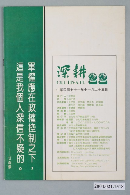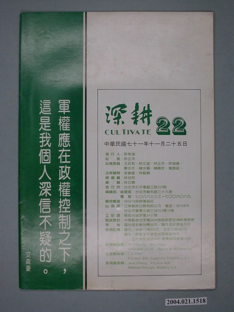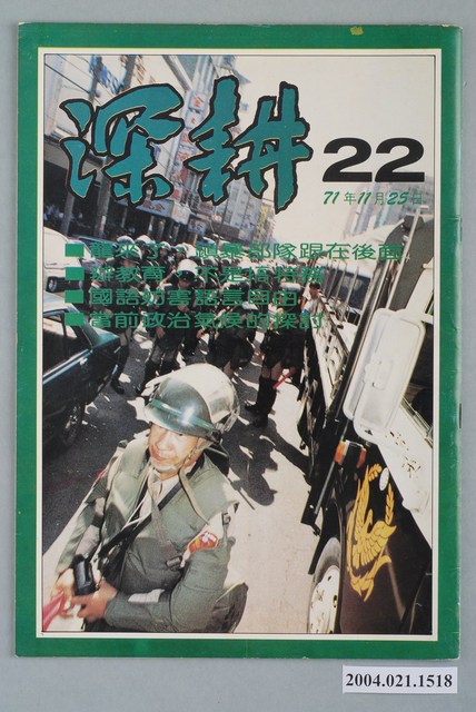 此為一紙質雜誌,此物件以照片為封面,並以綠色字體標示物件之名稱,本物件為1982年11月發行之《深耕》半月刊第22期(總號第22期),封面內容計有〈龍來了,鎮暴部隊跟在後面〉、〈辦教育,不是搞特務〉、〈國語妨害語言自由〉、〈當前政治氣候的探討〉等。目錄計有(一)封面、(1)無暴可鎮(卡子)、(二)地下室手記(編輯部)、(三)讀者投書(本社)、(四)黨外政論、(1)山雨欲來風滿樓-當前政治氣候的探討(鄭南榕)、(2)辦教育,不是搞特務-臺大教授談代聯會普選事件(本社)、(3)與張旭成教授一席談(李寧)、(4)國語妨碍語言自由(劉福增)、(5)五花大綁的律師制度-訪江鵬堅律師(林小魚)、(五)問政議壇、(1)霧峯書簡(阿部正)、(1.1)大家一起來和稀泥、(1.2)那一個黨外議員在包工程、(六)生活與政治、(1)大家來學習組織(張晉城)、(2)不要欺負我們不懂俄文(林小魚)、(3)本是同根生,相煎何太急-給宋楚瑜局長的忠告(黃森松)、(七)地方政情、(1)龍來了,鎮暴部隊跟在後面-記尤清.許榮淑台中市聯合服務處成立(本社)、(八)政策研究、(1)全島大搬家-檢討臺灣的人口移動政策(蕭平)、(2)不要再嚐一次多氯聯苯中毒的教訓(林國風)、(九)人權通訊、(1)印尼(簡勇譯):、(1.1)我不喜歡一個總統、(1.2)侮辱國家元首的罪名、(十)國際觀察、(1)克里姆林宮新政權爭奪戰(金鳴驛)、(十一)鄉土.人物.文化、(1)日本統治臺灣秘史(一)(廖祖堯譯)、(2)寓言一則-戶外多討厭的烏鴉.庭前飼可愛的喜鵲(夏天)、(3)黨員頌讚主委(阿K)、(十二)寶島戒嚴十誡(高尙士)、(十三)漫畫(PIC) 等。 此件為《深耕》雜誌的系列刊物之一,《深耕》為1981年由黃石城創辦的黨外政論雜誌,後交由許榮淑經營,主要主筆人包含林正杰、林世煜、林濁水等,其中內容包括編輯手記、國會趨勢、選舉與黨外動向、生活與政治、鄉土人物、藝文、漫畫等等。《深耕》曾在1982年對於「杯葛事件」中的部分黨外立委進行批判,並引起當時黨外勢力的對立。所謂「黨外」為中國國民黨之外的政治勢力,「黨外」在國民黨政府的治下運用創辦雜誌的方式表達立場、對抗國民黨政府,這些雜誌、出版品被稱為「黨外雜誌」,《深耕》系列亦是其中之一。
