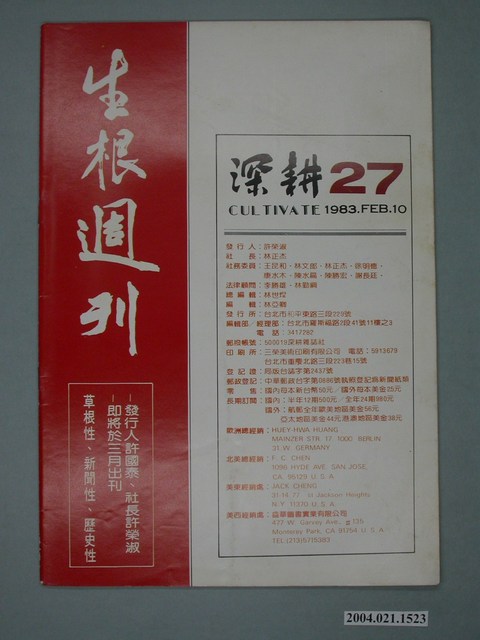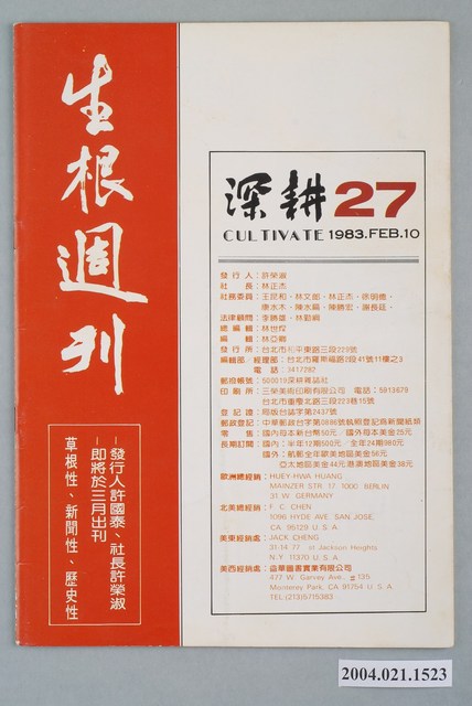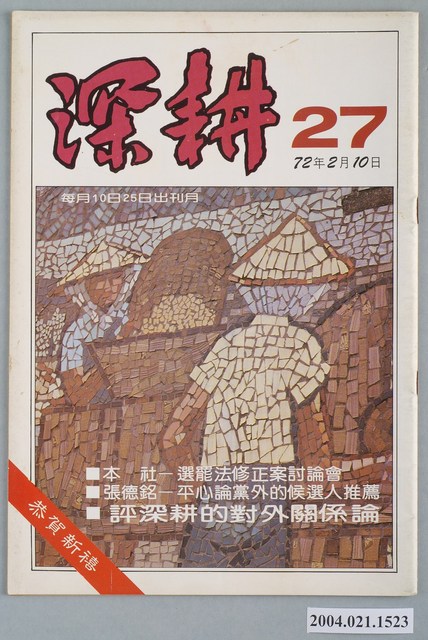 此為一紙質雜誌,此物件以照片為封面,並以紅色字體標示物件之名稱,本物件為1983年2月發行之《深耕》半月刊第27期(總號第27期),封面內容計有〈選罷法修正案討論會〉(本社)、〈平心論黨外的候選人推薦〉(張德銘)、〈評深耕的對外關係論〉等。目錄計有(一)封面(顏水龍)、(二)閣樓手記(編輯部)、(三)讀者投書(本社)、(四)選罷法修正案討論會(本社)、(五)推薦與選舉、(1)平心論黨外的候選人推薦(張德銘)、(2)黨外的推薦秀(林世煜)、(六)黨外.黨外(本社)、(七)問政議壇、(1)第一滴血-黨外市議員的杯葛事件(水龍生)、(2)窮則變,變則通?-省議會通過查禁電玩草案(阿部正)、(八)黨外政論、(1)虛幻意識與外交原則-評深耕的對外關係論(林文菊)、(2)臺灣經濟奇蹟的背後(南兵和)、(3)你可能也是流氓-訪蔡墩銘、陳水扁談流氓取締辦法(蘇達明)、(4)遠來的和尚不唸經-觀察國民黨的外資策略(荊濟仁)、(九)生活與政治、(1)請勿殘殺經濟耕牛(王隱)、(十)地方政情、(1)正視公共設施保留地徵收問題-二重疏洪道自力救濟事件有感(陳勝宏)、(2)豈止一個二重疏洪道-嘉義仁義潭水庫淹沒區(淹沒區居民)、(3)有情向誰訴,無語問蒼天-正視我們的陳情案(莊存堅)、(十一)人權通訊、(1)菲律賓的反對派領袖-狄可諾(林國風譯)、(十二)國際觀察、(1)田中角榮跳得過「民主牆」嗎?-洛克西德案進入高潮(金鳴譯)、(十三)鄉土與文化、(1)日本統治臺灣秘史(四)(廖祖堯譯) 等。 此件為《深耕》雜誌的系列刊物之一,《深耕》為1981年由黃石城創辦的黨外政論雜誌,後交由許榮淑經營,主要主筆人包含林正杰、林世煜、林濁水等,其中內容包括編輯手記、國會趨勢、選舉與黨外動向、生活與政治、鄉土人物、藝文、漫畫等等。《深耕》曾在1982年對於「杯葛事件」中的部分黨外立委進行批判,並引起當時黨外勢力的對立。所謂「黨外」為中國國民黨之外的政治勢力,「黨外」在國民黨政府的治下運用創辦雜誌的方式表達立場、對抗國民黨政府,這些雜誌、出版品被稱為「黨外雜誌」,《深耕》系列亦是其中之一。
