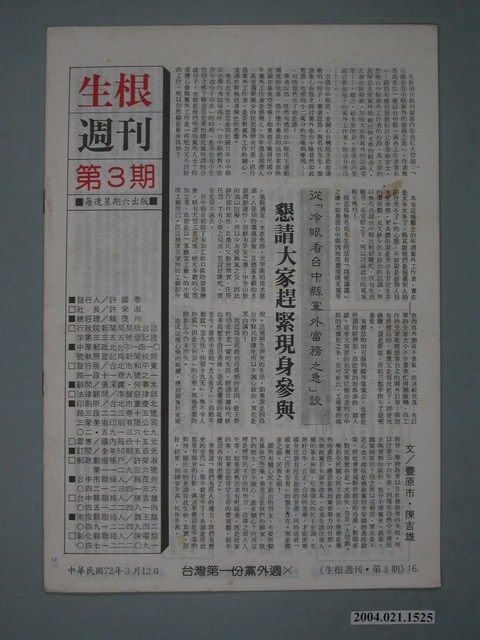 此為一紙質雜誌,此物件以白色為底,封面中央置有照片,並以紅框白字標示物件之名稱,本物件為1983年3月發行之《生根》週刊第三期,封面內容計有(一)封面∕〈香蕉成熟時〉(原載「攝影臺灣」58頁)、(二) 星期人物∕〈獻堂先生夢裡有憾否?〉(編輯部)、(三)第七屆黨外省議員第二次大會省政總質詢巡迴展(上)∕〈今後臺灣再無「魔杖式」德政〉(賴茂洲)、〈讓民主與法治生根〉(陳南州)、〈溝通與共識的基礎何在?〉(周滄淵)、〈如何塑造安定的政治環境〉(陳金德)、〈當前金融體制出現危機!〉(傅文政)、〈掀起臺灣的民主生存運動〉(洪振宗)、〈地下經濟活動與國宅問題〉(林漢周)、〈為省營事業的老毛病把脈〉(簡錦益)、〈南迴鐵路工程處千瘡百孔〉(余玲雅)、〈懇請大家趕緊現身參與〉(陳吉雄)等。 此件為《深耕》雜誌的系列刊物之一,《深耕》為1981年由黃石城創辦的黨外政論雜誌,後交由許榮淑經營,主要主筆人包含林正杰、林世煜、林濁水等,其中內容包括編輯手記、國會趨勢、選舉與黨外動向、生活與政治、鄉土人物、藝文、漫畫等等。《深耕》曾在1982年對於「杯葛事件」中的部分黨外立委進行批判,並引起當時黨外勢力的對立。所謂「黨外」為中國國民黨之外的政治勢力,「黨外」在國民黨政府的治下運用創辦雜誌的方式表達立場、對抗國民黨政府,這些雜誌、出版品被稱為「黨外雜誌」,《深耕》系列亦是其中之一。
