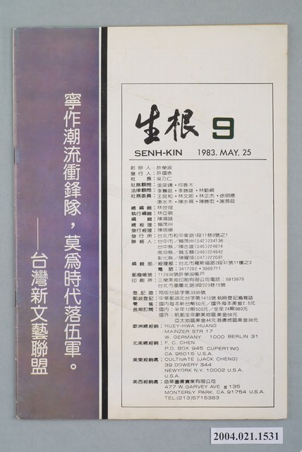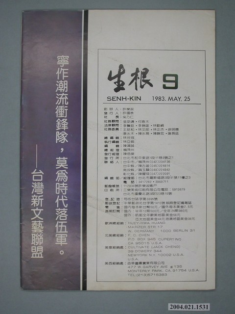 此為一紙質雜誌,此物件以畫作為封面,並以紫色字體標示物件之名稱,本物件為1983年5月發行之《生根》週刊第9期,封面內容計有〈王昇,日日升,升為王?〉、〈對抗•和解•道歉――康寧祥開惡例〉、〈海外對國民黨迫害人權的控訴〉等。目錄計有(一)封面、(1)廟(陳澄波)、(二)閣樓手記(編輯部)、(三)讀者投書(本社)、(四)生活與政治、(1)王昇,日日升,升為王?(張耿豪)、(2)不堪重彈將軍令-王昇調職傳聞(江帆)、(3)高雄事件受刑人吃些什麼-龜山大飯店的民生問題(蘇克福)、(4)海外對國民黨迫害人權的控訴(資料室)、(5)料所必然(夏天)、(五)黨外政論、(1)對抗.和解.道歉-康寧祥開惡例(夏義)、(2)各說各話(本社)、(3)警察好打「手槍」(埋冤魂)、(4)不許臺灣人有刀槍(良光)、(六)問政議壇、(1)黨籍護法語錄(鄭智仁)、(2)國會熱線(文哲)、(3)霧峯行腳(阿部正)、(4)台北議壇(游清清)、(5)活到老,代表到老!-王兆釧談國大代表(林小魚)、(七)黨外.黨外(本社)、(八)大學新聞(知青)、(九)超級黨員的組合-覺民學會(吳敬曦)、(十)臺灣社會黨案、(1)五億交通違規罰款那裏來(吳自然)、(十一)政策研究、(1)算算官方統計的帳-為臺灣統計作業系統資訊化摧生(蕭平)、(十二)鄉土與文化、(1)後藤新平「現代化」的另一面(劉省三)、(十三)黨外雜誌叢書出刊時間表 等。