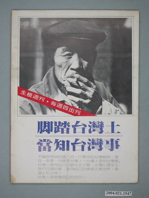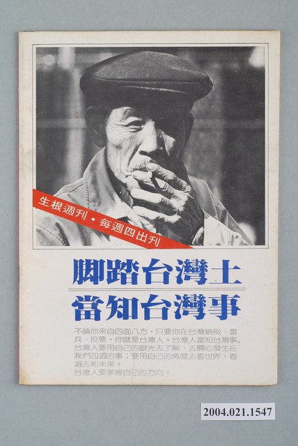 此為一紙質雜誌,此物件以紫色為底,並以紅色字體標示物件之名稱,本物件為1983年12月發行之《生根》週刊第10期,封面內容計有〈兩個貪污的肥官)、〈唐榮公司前董事長郭永將軍――原任臺灣省警政署長)、〈北市國宅處張天泰上校――原任國家安全局組長〉等。目錄計有(一)編輯室筆記、(二)唐榮公司貪汙案、(1)唐榮‧郭永‧貪--監察院擦棒球,省議員全壘打(高森松)、(三)北市國宅貪汙案、(1)國宅造就多少富翁--台北市國宅處長貪汙被捕(凃明則)、(2)算算國宅的老帳(馬腳)、(四)接班大猜謎、(1)國民黨的二中接班大會(李藍山)、(2)誰將是「新任」中常委(鄭智人)、(五)回首一九八三、(1)一九八三國際「黨外」新聞(阿川)、(2)一九八三黨外十大新聞(游清清)、(3)國民黨年度穿梆新聞(弄臣)、(六)國民黨式政治官司、(1)陳定南移送法辦始末(劉志傑)、(七)政壇一週、(八)憲政風波、(1)李鴻禧教授談「擴充臨時條款」(江城)、(九)黨外‧黨外、(1)從白雅燦絕食十五天談起(吳敏肇)、(2)編輯作家聯誼會記實(江水涵)、(3)劫機六義士在台北受審(幻想家)、(十)臺灣社會檔案、(1)大專兵「拉伕」充軍官(余慧思)、(十一)國際觀察、(1)田中時代的結束(吳花)、(2)「一黨獨大」的日本模式(陳日勤)、(十二)大亨小傳、(1)太子立委-許勝發(陶朱太史)、(十三)臺灣史、(1)臺灣農民運動史(II)(高伊哥) 等。 此件為《深耕》雜誌的系列刊物之一,《深耕》為1981年由黃石城創辦的黨外政論雜誌,後交由許榮淑經營,主要主筆人包含林正杰、林世煜、林濁水等,其中內容包括編輯手記、國會趨勢、選舉與黨外動向、生活與政治、鄉土人物、藝文、漫畫等等。《深耕》曾在1982年對於「杯葛事件」中的部分黨外立委進行批判,並引起當時黨外勢力的對立。所謂「黨外」為中國國民黨之外的政治勢力,「黨外」在國民黨政府的治下運用創辦雜誌的方式表達立場、對抗國民黨政府,這些雜誌、出版品被稱為「黨外雜誌」,《深耕》系列亦是其中之一。