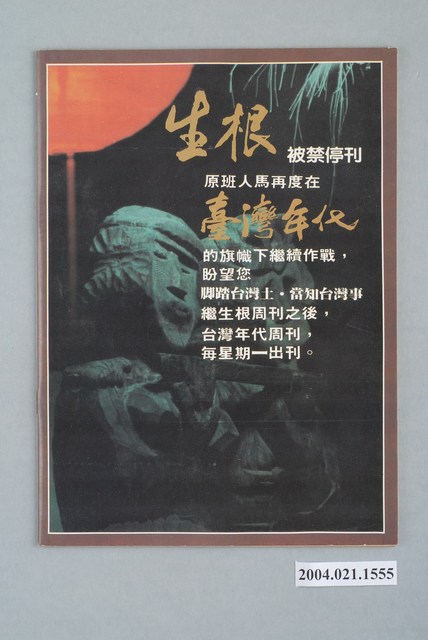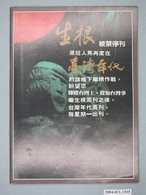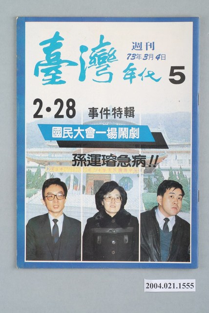 此為一紙質雜誌,在封面上方寫有本書標題、期號以及出版日期,並在封面刊有三位人物的照片以及陽明山中山樓的背景,另外節錄本刊物的部份內容,背面則刊有此雜誌的創刊原因。此書為臺灣年代雜誌社1984年出版的《臺灣年代》週刊第5號。 此件為《深耕》雜誌的衍生刊物之一,其最重要的發行人為許榮淑。《深耕》相較其他同時期的雜誌更富有批判性,亦更受社會矚目,其批判對象並不僅限於國民黨,連當時的黨外勢力也同時受其針砭。代表案例是其在1982年「杯葛事件」中針對「黨外主流派」妥協立場的批判。《深耕》成為黨外運動路線改變的原因之一,另外也造成黨外勢力的對立。 「黨外」一詞主要為非中國國民黨的臺灣政治勢力,而「黨外」政治勢力,主要的宣傳方式為「黨外雜誌」,「黨外雜誌」最早如1950年代的《自由中國》、1970年代的《大學》、《臺灣政論》,後在1980年代「黨外雜誌」發展蓬勃,代表刊物為《八十年代》與《美麗島》,最終,這股媒體趨勢在1986年民進黨成立、1987年解除戒嚴之後逐漸式微。「黨外雜誌」在當時激起了臺灣民眾的民主意識,也逐步促成了言論自由開放。(蕭淑玲,2006,153-155)。