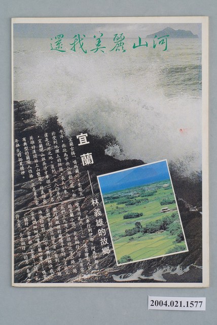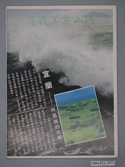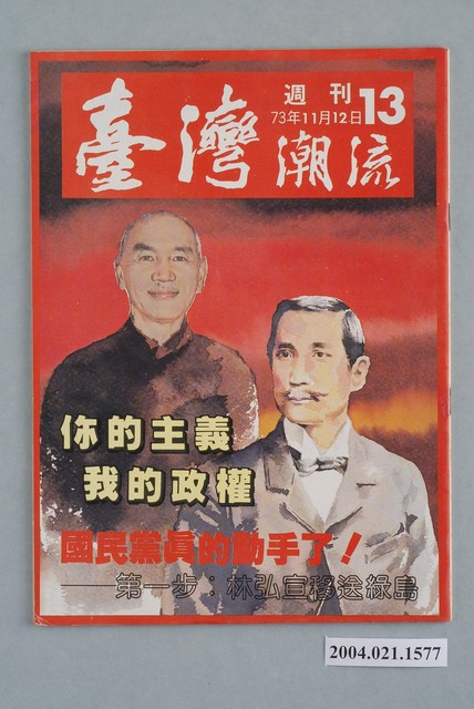 此為一紙質雜誌,在封面上方寫有本書標題、期號以及出版日期,並在封面刊有蔣中正與孫文的插圖,另外節錄本刊物的部份內容,背面則刊有介紹宜蘭並連帶宣傳林義雄的文宣。此書為臺灣年代雜誌社1984年出版的《臺灣潮流》週刊第13號。 此件為《深耕》雜誌的衍生刊物之一,其最重要的發行人為許榮淑。《深耕》相較其他同時期的雜誌更富有批判性,亦更受社會矚目,其批判對象並不僅限於國民黨,連當時的黨外勢力也同時受其針砭。代表案例是其在1982年「杯葛事件」中針對「黨外主流派」妥協立場的批判。《深耕》成為黨外運動路線改變的原因之一,另外也造成黨外勢力的對立。 「黨外」一詞主要為非中國國民黨的臺灣政治勢力,而「黨外」政治勢力,主要的宣傳方式為「黨外雜誌」,「黨外雜誌」最早如1950年代的《自由中國》、1970年代的《大學》、《臺灣政論》,後在1980年代「黨外雜誌」發展蓬勃,代表刊物為《八十年代》與《美麗島》,最終,這股媒體趨勢在1986年民進黨成立、1987年解除戒嚴之後逐漸式微。「黨外雜誌」在當時激起了臺灣民眾的民主意識,也逐步促成了言論自由開放。(蕭淑玲,2006,153-155)。