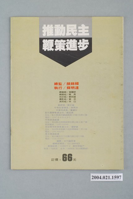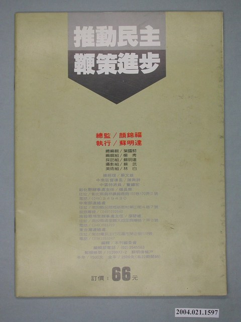 此為一紙質雜誌,在封面上方寫有本書標題、期號以及出版日期,並在封面刊有吳淑珍握手的照片,另外節錄本刊物的部份內容,背面則刊有此刊物的相關出版資訊,並寫有「推動民主」、「鞭策進步」的標語。此書為領先雜誌社1987年出版的《領先叢刊》第9號總號52號。 此件《民進年代》雜誌為系列黨外雜誌其中之一,該系列有《九十年代》、《民進年代》、《領先週刊》等週刊,《民進年代》為純粹為民進黨新聞服務的雜誌,並期許為民眾帶來平實、客觀的報導,雜誌社的成員也都是民進黨的青年黨工,與當時期出版的《民進週刊》一樣都與民進黨有著密切關係,但反對並批評《民進週刊》運用女星做宣傳的策略。《民進年代》對民進黨逐漸以公職掛帥並遠離群眾的路線有所批評。 「黨外」一詞主要為非中國國民黨的臺灣政治勢力,而「黨外」政治勢力,主要的宣傳方式為「黨外雜誌」,「黨外雜誌」最早如1950年代的《自由中國》、1970年代的《大學》、《臺灣政論》,後在1980年代「黨外雜誌」發展蓬勃,代表刊物為《八十年代》與《美麗島》,最終,這股媒體趨勢在1986年民進黨成立、1987年解除戒嚴之後逐漸式微。「黨外雜誌」在當時激起了臺灣民眾的民主意識,也逐步促成了言論自由開放。(蕭淑玲,2006,153-155)。