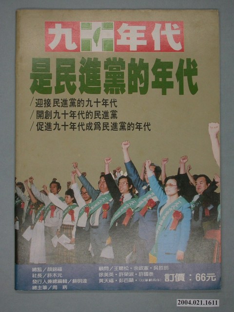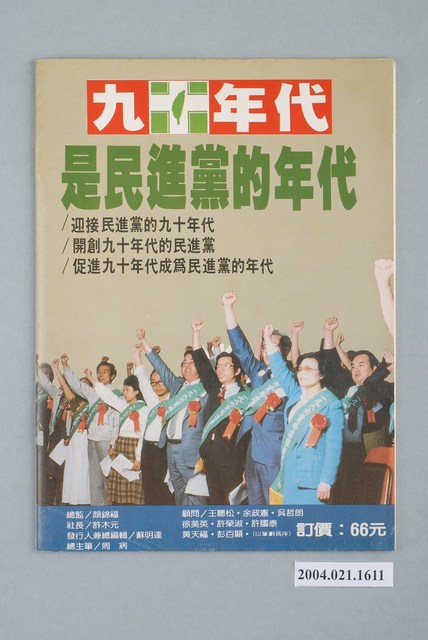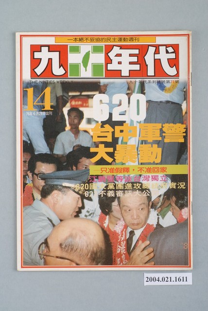 此為一紙質雜誌,在封面上方寫有本書標題、期號以及出版日期,並在封面刊有六二零事件衝突的照片,另外節錄本刊物的部份內容,背面則刊有此刊物的出版資訊,並也刊載此刊物的宣傳廣告。此書為九十年代雜誌社1987年出版的《九十年代》週刊第14號總號71號。 此件《民進年代》雜誌為系列黨外雜誌其中之一,該系列有《九十年代》、《民進年代》、《領先週刊》等週刊,《民進年代》為純粹為民進黨新聞服務的雜誌,並期許為民眾帶來平實、客觀的報導,雜誌社的成員也都是民進黨的青年黨工,與當時期出版的《民進週刊》一樣都與民進黨有著密切關係,但反對並批評《民進週刊》運用女星做宣傳的策略。《民進年代》對民進黨逐漸以公職掛帥並遠離群眾的路線有所批評。 「黨外」一詞主要為非中國國民黨的臺灣政治勢力,而「黨外」政治勢力,主要的宣傳方式為「黨外雜誌」,「黨外雜誌」最早如1950年代的《自由中國》、1970年代的《大學》、《臺灣政論》,後在1980年代「黨外雜誌」發展蓬勃,代表刊物為《八十年代》與《美麗島》,最終,這股媒體趨勢在1986年民進黨成立、1987年解除戒嚴之後逐漸式微。「黨外雜誌」在當時激起了臺灣民眾的民主意識,也逐步促成了言論自由開放。(蕭淑玲,2006,153-155)。