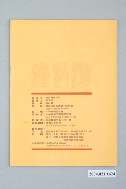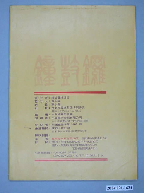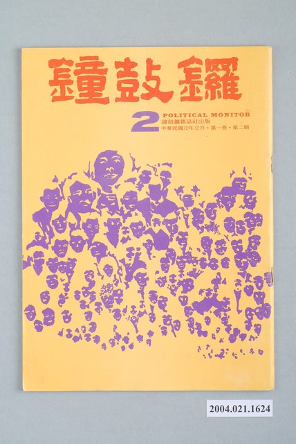 此為鐘鼓鑼雜誌社1983年2月出版的《鐘鼓鑼》雜誌第1卷第2期總號第2號,內容計有〈恭喜發財〉(黃天福)、〈國家需要反對黨和年輕接班人-李光耀談接班人問題〉(李光耀)、〈戒嚴法與出版法下的言論出版自由〉( 陳駿)、〈高雄事件的衝擊〉(蘇特)、〈台北市議會的明星議員在做什麼?〉(吳明山)、〈阿扁仔一天的生活〉(尚宗)、〈游錫堃的議員生涯〉( 沈寶庭)、〈蘇南成「行動歸隊」「精神閹割」〉(曾心儀)、〈再會吧,雨夜花主義〉(何文振)、〈精子.國民黨.黨外〉(黃斯文)、〈黨外立委在立法院-訪費希平委員〉( 愁人)、〈專制獨裁與恐怖屠殺-朱元璋的心理考察〉(李哮佛)、〈軍事獨裁必敗 自由民主必勝-阿根廷民主運動獲得成功〉(南方朔)等。 此物件為《鐘鼓鑼》雜誌,此雜誌的前身為《鐘鼓樓》雜誌,且在1980年「美麗島大審」後不久,就接著創刊,創刊號可謂是美麗島事件專號,然而立刻遭到查禁,於是創刊人黃天福(為黃信介之弟),於1983年1月創辦《鐘鼓鑼》,並自詡做為黨外力量的先鋒,並投身爭取民主政治的「戰場」之中,此雜誌為1980年代崛起的黨外雜誌之一,重要的創辦人黃天福以及陳水扁。 「黨外」一詞主要為非中國國民黨的臺灣政治勢力,而「黨外」政治勢力,主要的宣傳方式為「黨外雜誌」,「黨外雜誌」最早如1950年代的《自由中國》、1970年代的《大學》、《臺灣政論》,後在1980年代「黨外雜誌」發展蓬勃,代表刊物為《八十年代》與《美麗島》,最終,這股媒體趨勢在1986年民進黨成立、1987年解除戒嚴之後逐漸式微。「黨外雜誌」在當時激起了臺灣民眾的民主意識,也逐步促成了言論自由開放。(蕭淑玲,2006,153-155)。