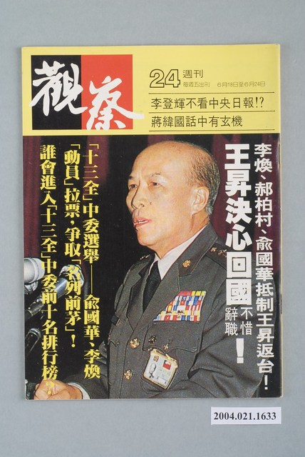 此為觀察雜誌社1988年6月18日出版的《觀察》週刊第24號,內容計有〈王昇決心返國!〉( 劉愷)、〈蔣緯國話中有玄機〉(孫奇)、〈李登輝不看「中央日報」?!〉(尤偉)、〈「十三全」中央委員選舉-俞國華、李煥爭取「名列前茅」〉(鄒亞)、〈國民黨起訴朱高正、尚潔梅〉(東南飛)、〈「老兵行動聯盟」聲援「五一一事件」難友、質疑雷渝齊先生〉( 卒子)、〈黃怡接任「進步婦盟」總召集人〉(鍾龍)、〈認識戈巴契夫這個人〉(尼克森)、〈周恩來與溥儀〉(沈醉)、〈「總統也借用台銀房舍」真相〉(林中)、〈透視「十三全」以後的」變化」-行政院長可能人選一一檢視!〉(徐昱)、〈「十三全」中央委員前十名排行榜預測〉(葉山)等。 此物件為《觀察》雜誌,為《政治家》雜誌被查禁後的接續刊物,於1988年創辦,主要的創辦人為鄧維楨、《民主叢書》、《觀察》等。鄧維楨為《大學雜誌》的創辦人,此雜誌於1960年代末期至1970年代初為臺灣社會帶來監督政府、社會改革的風氣,而到了美麗島事件後,造成民眾對政治議題的關心,鄧維楨也隨之創辦《政治家》雜誌介紹黨外人物,也加以介紹黨外的活動以及評論政治時局。鄧維楨在在臺灣文化界活動,參與創辦遠景、遠流、長橋、鹿橋等出版社,也為重要的黨外人士。 「黨外」一詞主要為非中國國民黨的臺灣政治勢力,而「黨外」政治勢力,主要的宣傳方式為「黨外雜誌」,「黨外雜誌」最早如1950年代的《自由中國》、1970年代的《大學》、《臺灣政論》,後在1980年代「黨外雜誌」發展蓬勃,代表刊物為《八十年代》與《美麗島》,最終,這股媒體趨勢在1986年民進黨成立、1987年解除戒嚴之後逐漸式微。「黨外雜誌」在當時激起了臺灣民眾的民主意識,也逐步促成了言論自由開放。(蕭淑玲,2006,153-155)。
