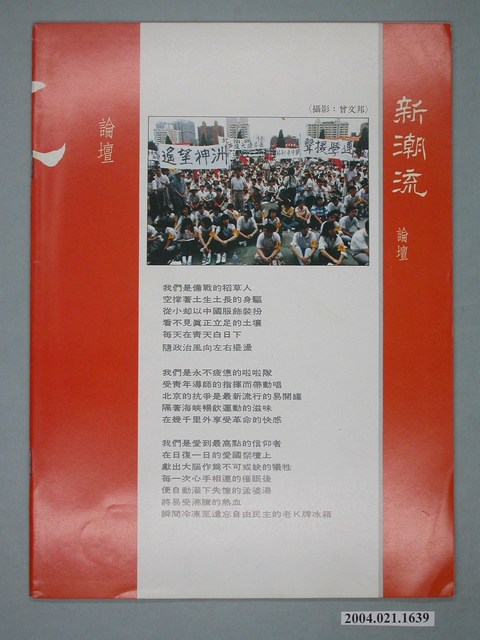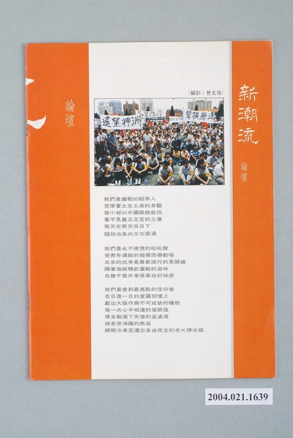 此為一紙質雜誌,在封面上方寫有本書標題、期號以及出版日期,並在封面刊有插圖做封面設計,同時也節錄本刊物的部份內容,背面則刊載此雜誌的介紹以及成立刊物的宗旨。此書為新潮流雜誌社1989年出版的《新潮流》雜誌第7號。 本物件為《新潮流》雜誌,此雜誌由吳乃仁、邱義仁等人於1984年創辦,此雜誌主要的十八位撰稿以及編輯人被稱為「十八飛鷹」,而這些人員後來加入民進黨後,成為其中的「新潮流」派系。新潮流以有著嚴格的紀律為名,並成為民進黨的一大派系之一。此派系中重要的人物有:吳乃仁、邱義仁、洪其昌、林濁水。 「黨外」一詞主要為非中國國民黨的臺灣政治勢力,而「黨外」政治勢力,主要的宣傳方式為「黨外雜誌」,「黨外雜誌」最早如1950年代的《自由中國》、1970年代的《大學》、《臺灣政論》,後在1980年代「黨外雜誌」發展蓬勃,代表刊物為《八十年代》與《美麗島》,最終,這股媒體趨勢在1986年民進黨成立、1987年解除戒嚴之後逐漸式微。「黨外雜誌」在當時激起了臺灣民眾的民主意識,也逐步促成了言論自由開放。(蕭淑玲,2006,153-155)。